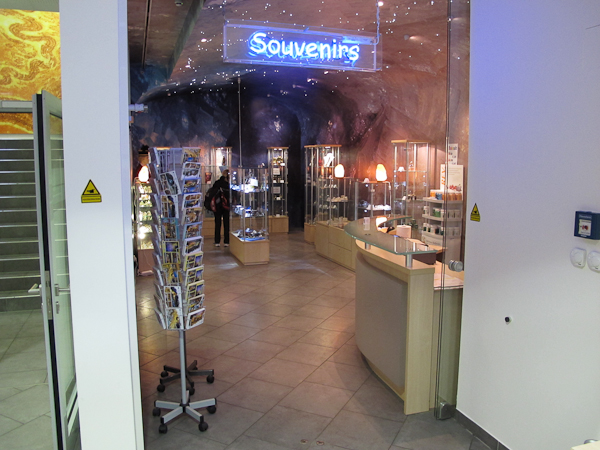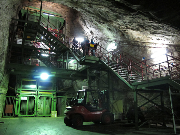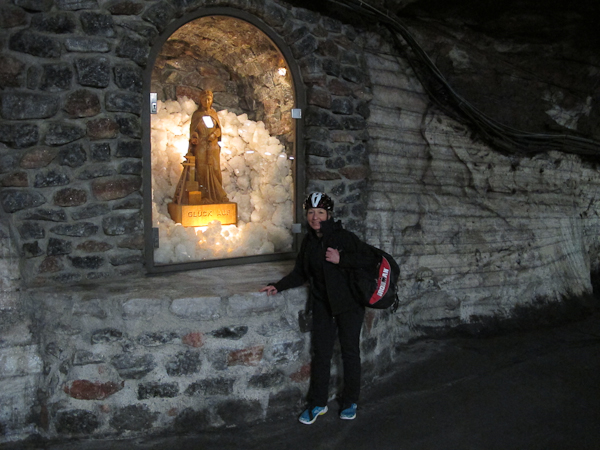 Wir steigen aus und stehen in einem kahlen Vorraum. Vor uns eine geschlossene graue Stahltür. Ist das das Tor zur Hölle? Ein Bergmann öffnet die Türe und wir gelangen in ein nur mäßig beleuchtetes Tunnellabyrinth. Rechts stehen in Reih und Glied sauberpolierte, nummerierte, knallgelbe LKWs. Alles, dem wir hier unten begegnen, also auch die gasbetriebenen LKWs, ist auf demselben Weg herabgekommen wie wir selbst. Links von uns sehen wir, im Salzstein eingelassen und dezent angestrahlt, die Statue der einst grausam gefolterten Heiligen Barbara, Schutzpatronin der Bergleute, hinter Glas. Wenn einst die Bergmänner unter Tage der Erde ihre Schätze entrissen, dann beteten die Kinder für ihre Väter: "Sankt Barbara, bei Tag und Nacht, fahr' mit dem Vater in den Schacht! Steh Du ihm bei in jeder Not, bewahr' ihn vor dem jähen Tod!"