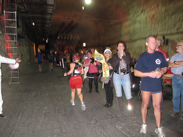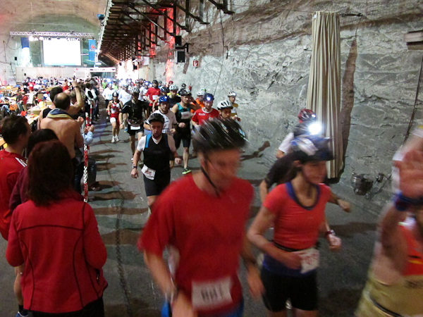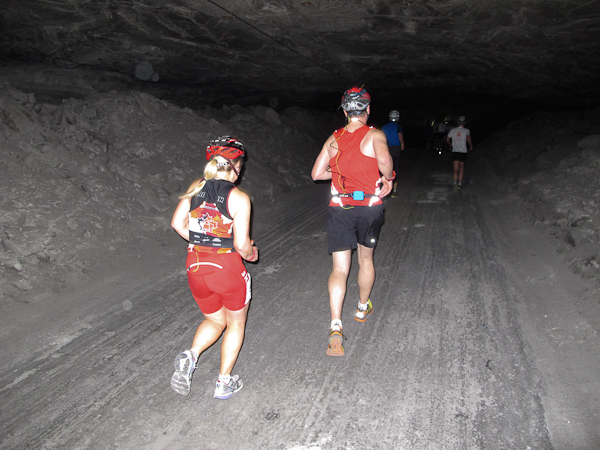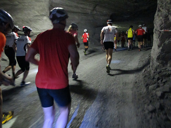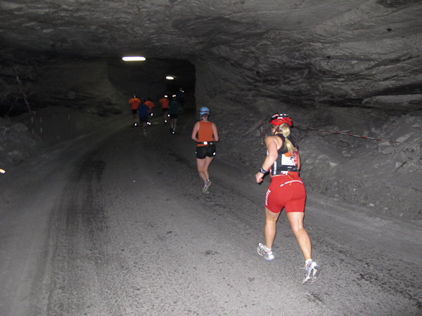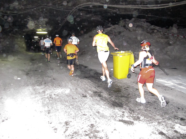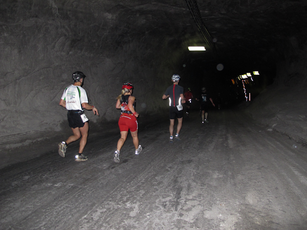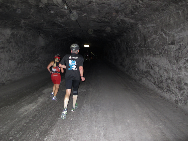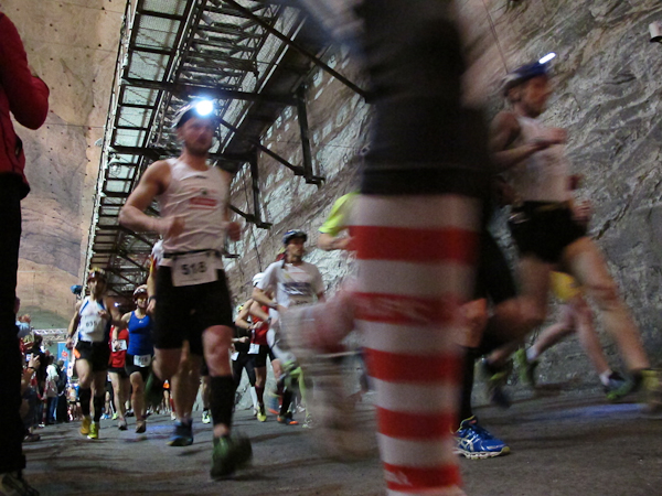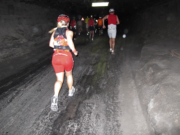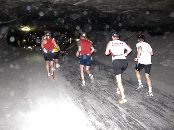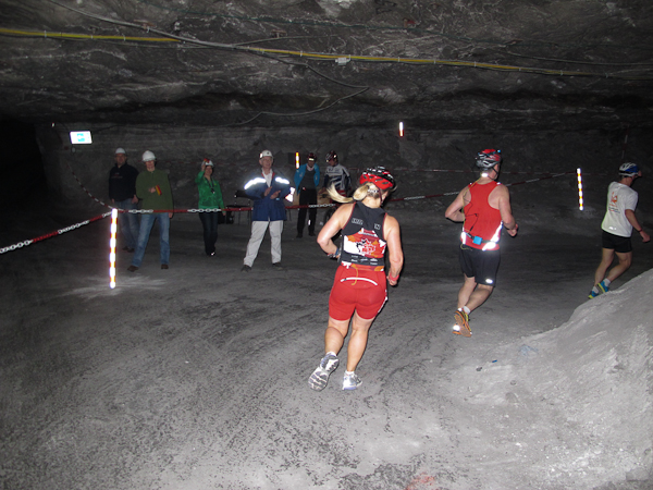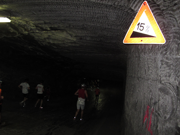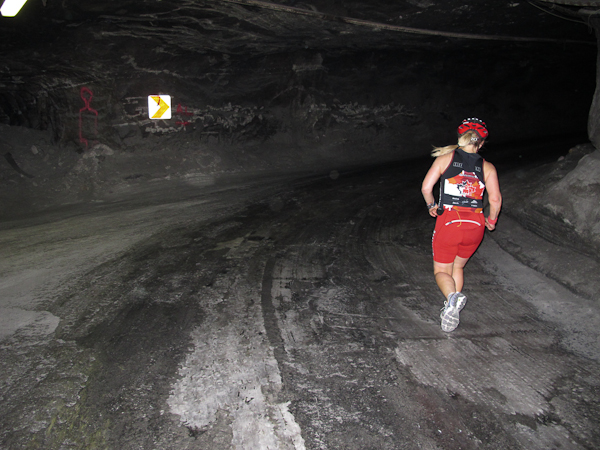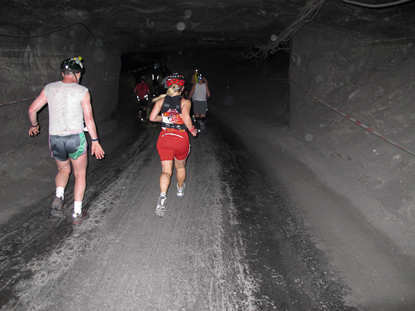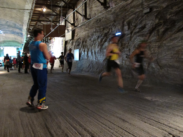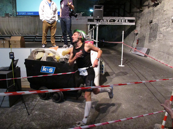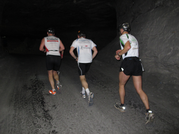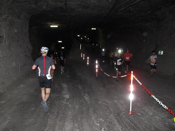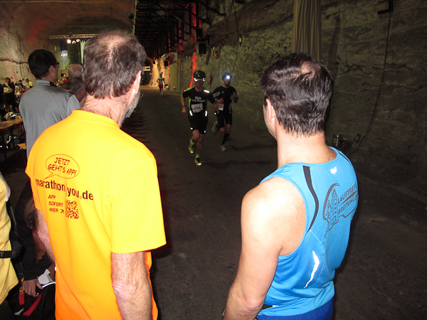 Die siebte Runde, der richtige Zeitpunkt das Rennen als Halbmarathon freiwillig zu beenden, wenn man nicht gerade unfreiwillig (2:45 Stunden) aus dem Rennen genommen wird. Runde acht. Ich bin ganz nah dran. So nah, dass ich schon wieder den großen Bereich erkennen kann. Je nachdem wie schnell man läuft, kann man in weniger als 5 bis 10 Minuten an Getränke und Verpflegung kommen und wenn es drängt auch an einen Abortkübel, auch Bergmannsklo genannt. Ihr wisst schon, so ein Behälter mit verschließbarem Deckel, in dem die Bergleute Untertage ihre Notdurft verrichten. Nein, so schlimm ist es ganz und gar nicht. Es gibt sogar richtige Dixi-Toilettenhäuschen, die mit dem leckeren Vanilleduft. So kurz ist eine Runde. Genaugenommen nur 3,2 Kilometer. Obwohl Merkers über ein Streckensystem von unglaublichen 4.600 km (!) - entstanden in den Jahren von 1914 bis 1993 verfügt.