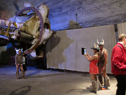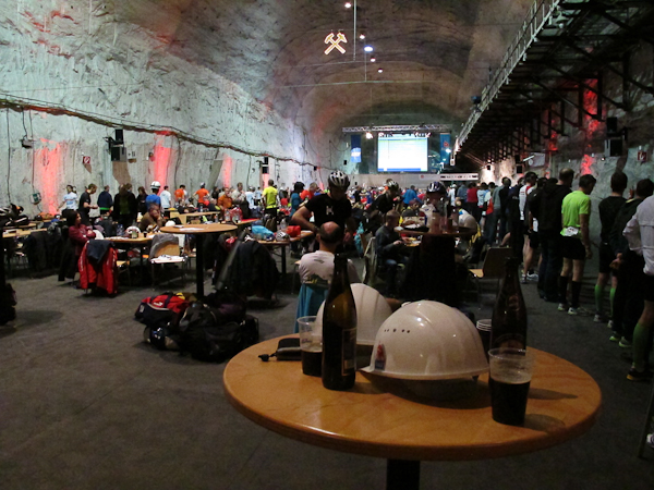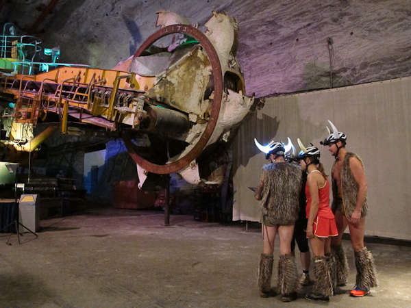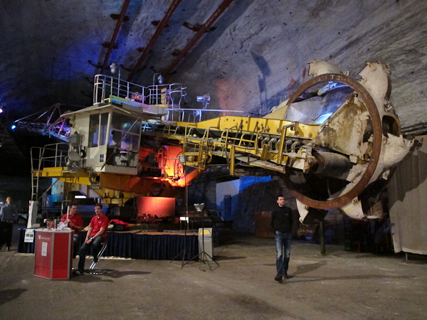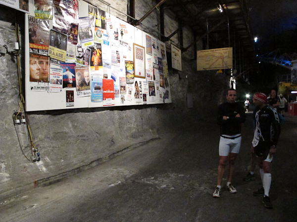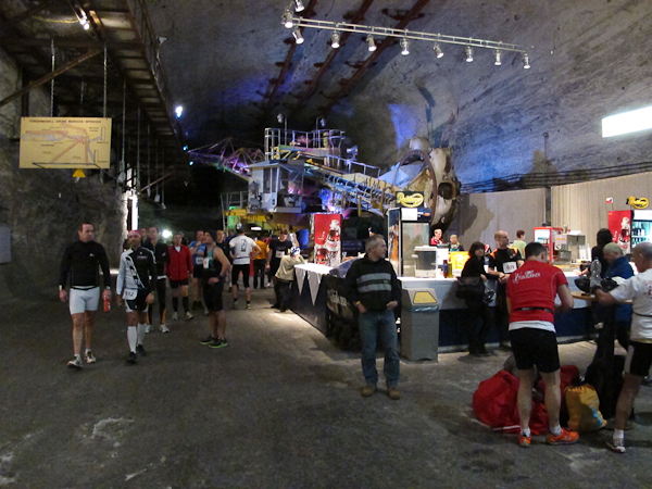 Noch eine Stunde bleibt uns bis zu unserem Start, Zeit zum Umschauen. Farbig illuminiert entdecken wir den größten und einzigen Schaufelradbagger unter Tage, von den Bergleuten wegen seines langen Auslegers liebevoll „Alf“ genannt. Plakate an den Wänden deuten von Auftritten bekannter Persönlichkeiten. Denn manchmal wird aus dem Bunker auch der größte unterirdische Konzertsaal. Auch die Läufer-Gesellschaft, die nun noch auf ihren Start wartet möchte „bespaßt“ werden. Doch Achtung: Wo zu viel Lust ist, ist auch Luzifer nicht weit!