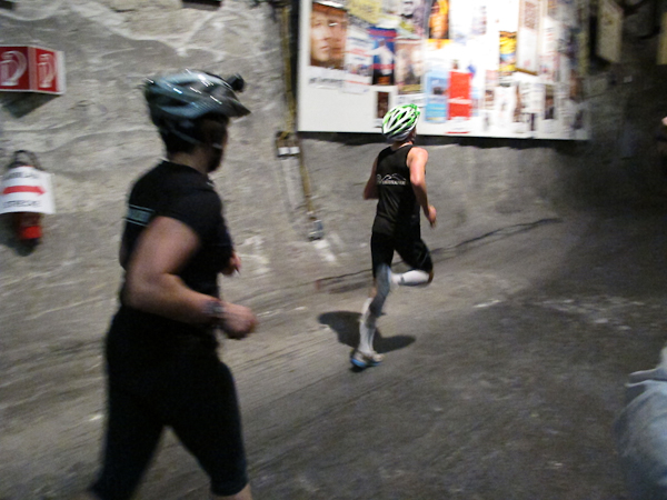 Was beim Triathlon doch eher peinlich ist, nämlich vom Rad steigen und dann mit dem Helm auf dem Kopf weiterlaufen, ist hier ganz normal. 276 behelmte Sportler nehmen Startaufstellung. Jedoch in in die falsche Richtung. Und tatsächlich, an den Helmen kannst du Rennradfahrer von Mountainbiker, Bergsteiger von „ich leihe mir mal deinen Helm“ Läufern unterscheiden. Die einen haben ihr Licht am Helm befestigt, andere nehmen die Lampe lieber in die Hand. Ich habe meine am Hosenbund befestigt, übrigens keine gute Idee. Die Lampe ist jedoch Pflicht, denn bei Stromausfall liefe man in die pechschwarze Dunkelheit.