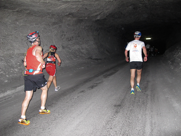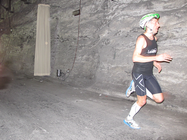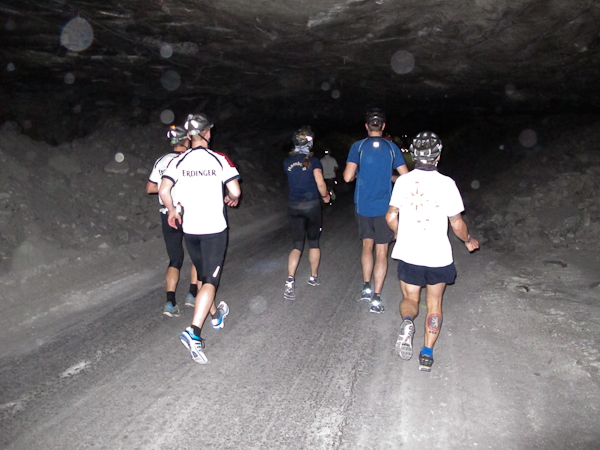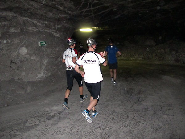 Es ist als wäre man plötzlich aus dem Winterschlaf erwacht und liefe bei Dunkelheit in einer Salzwüste. Der Kopf kocht unter dem Helm und obwohl mein Rennrad-Helm mit nur 300 Gramm über ein überragendes Belüftungssystem und tiefen Windtunnel-Kanälen verfügt und, laut Hersteller einen „selbst bei härtesten Hitzerennen nicht im Stich lässt“, verfolgt mich das ständige Bedürfnis mir den Helm vom Kopf zu reisen. Der Puls pocht bis hoch hinauf in die Halsschlagader. Bei jedem Atemzug spüre ich den trockenen Staub im Schlund, die Zunge klebt am Gaumen. Kein Wunder bei trockenen 30 % Luftfeuchte. Körpersalz klebt am Stoff des Laufshirts und auf unserer Haut. Kay verliert so viel davon, dass er dem Bergwerk noch Salz beifügen kann.