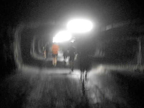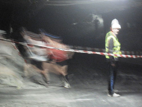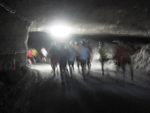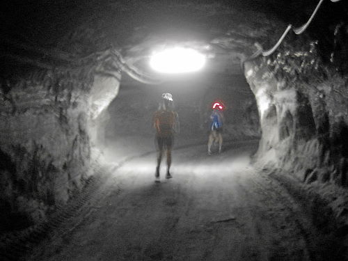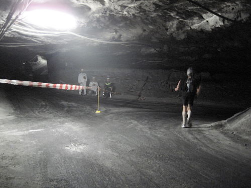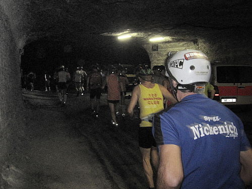 Noch etwa 50 Meter weiter, dann ging es nach rechts weg und schon war man auf der langen Geraden, bei der ich erst nach etwa 6 Runden sicher war, dass es nicht eben, sondern leicht bergauf ging. Vielleicht 700 m lang ging es also ganz sanft hoch, das Ende kündigte sich an, sobald man die Loren und die elektrische Lokomotive sah. Dann ging es nach links weg, sofort steil bergab und schon war man wieder an der Begegnungsstelle, diesmal aber auf der „besseren“ Seite, denn es waren nur noch etwa 600 m bis man wieder eine Runde geschafft hatte.