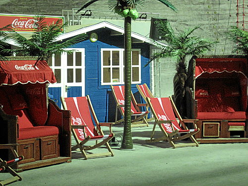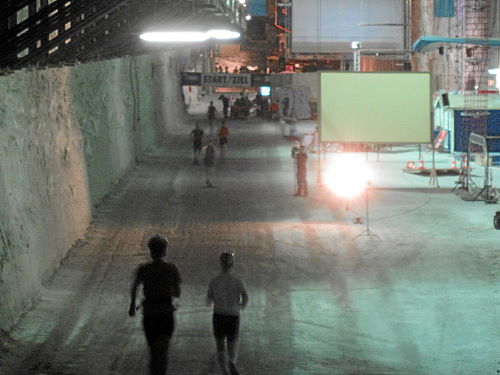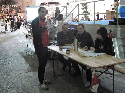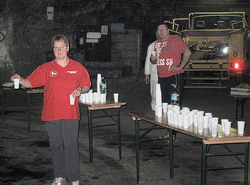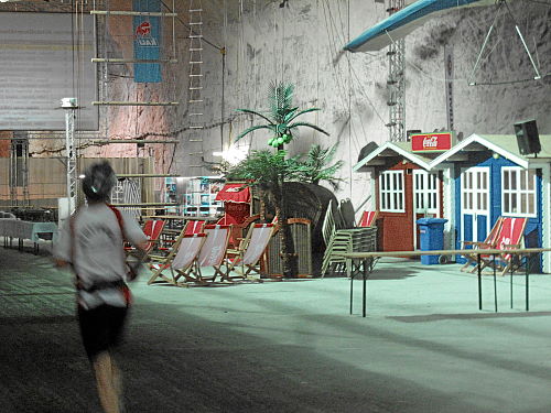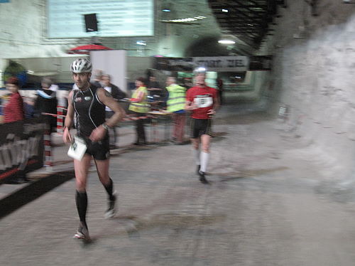 Zuvor aber kam noch der Wendepunkt und danach die ganz scharfe Rechtskurve, bei der man ein paar Meter abkürzen konnte. Jetzt nur noch bergab und schon sah man das grünleuchtende „Maul“ des „Großbunkers“. Hinein ohne Furcht, links weg und man lief die etwa 100 m in dieser großen Halle, vorbei an den Klettereinrichtungen, den Strandkörben und den elektronischen Rundenzählern. Unmittelbar danach konnte man seine Daten auf einer Projektionswand sehen - super gemacht! Man muss sich also keinerlei Sorgen machen, dass man eine Runde zuviel läuft, das wird alles exakt automatisch erfasst.