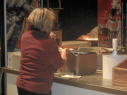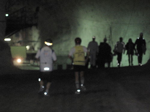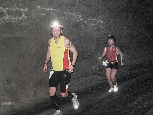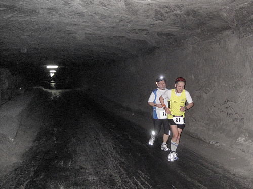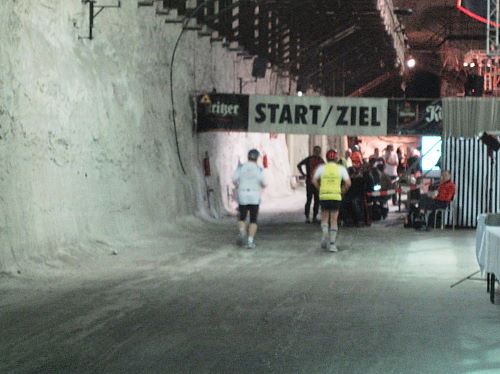 Weiter ging es bis an’s Ende der Halle und in die nächste Runde, links weg und wieder hinein in die dämmrige Unterwelt. Aber Halt! Stop! Hier war ja eine Verpflegungsstelle – und was für eine! Mindestens fünf Schmalzbrote habe ich hier im Laufe der Runden mitgenommen, nicht zu vergessen die Salzgürkchen, Bananen, Riegel und was weiß ich noch und bei jeder Runde natürlich einen Becher Wasser. Wer bei diesem Marathon irgendetwas an Verpflegung vermisste, kann nur ein notorischer Querulant sein. Zwei Verpflegungsstellen auf 3,25 km, so gut ausgestattet, wo findet man das?