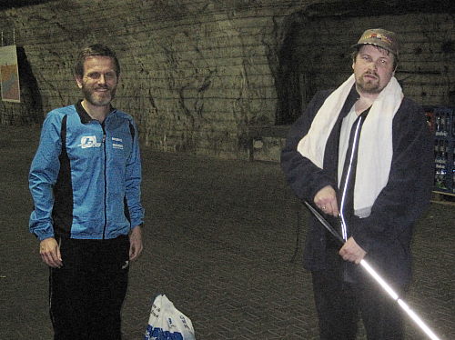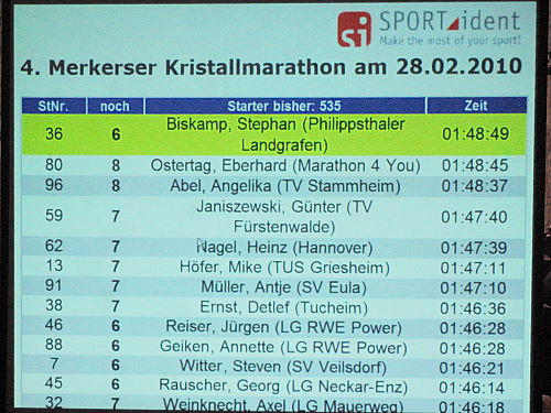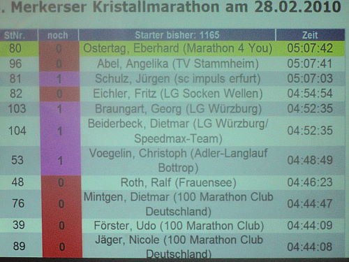 Trotz der leichteren Bedingungen gibt es beim Kristallmarathon dasselbe Zeitlimit wie in Sondershausen: Wer die Runde sieben nicht nach 2:45 h beendet hat, wird aus dem Rennen genommen und für den Halbmarathon gewertet. Aber im Gegensatz zu Sondershausen können selbst so langsame Läufer wie ich das Limit problemlos schaffen und tatsächlich hatte ich nach Runde sieben ein Zeitpolster von 10 Minuten. Danach aber wurde ich kontinuierlich langsamer, die Gehpausen länger und entsprechend auch meine Rundenzeiten. Aber manch Anderen ging das genauso und so konnte ich tatsächlich noch drei Läufer überholen. Darunter auch Didi, der bekannte blinde Läufer, mit Georg, seinem Begleiter. Didi hatte sein Training vernachlässigt, seit November weder einen Marathon noch lange Läufe mehr gemacht und war froh, dass er doch noch ordentlich ins Ziel kam, verlangte aber dann nach Ruhe und einem Bett.
