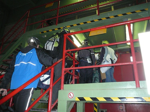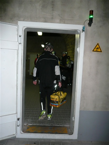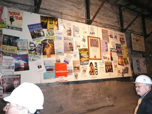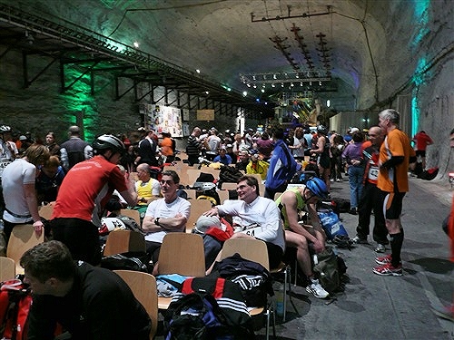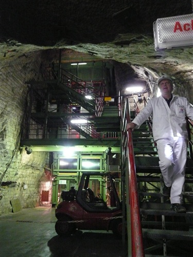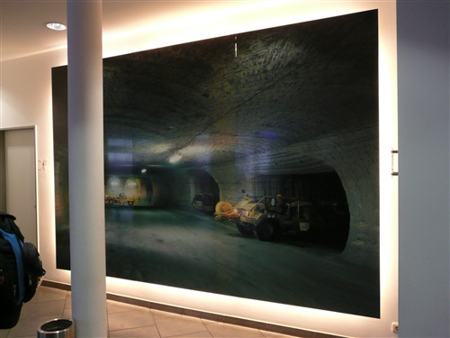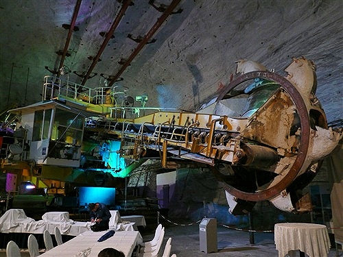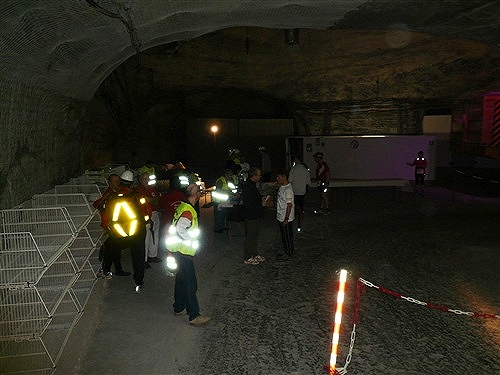 Unten erwartet uns erst einmal: Wärme! Tolle +21° lassen die obigen –5° schnell vergessen. Die Fahrt vom Ausstieg zum Ort des Geschehens ist wieder abenteuerlich: In drei Sitzreihen hocken wir auf einer Lkw-Ladefläche und der Fahrer düst, angeblich mit 35 km/h, über Stock und Stein Harakiri durch die Gänge, die wir teilweise auch später belaufen werden. Er ist nicht nur eine ausgesprochene Pistensau, sondern auch witzig. „Bitte bleiben Sie in Ihrem eigenen Interesse sitzen. Sie stehen nur einmal auf...“ Die riesige Halle, in der auch Konzerte stattfinden, überrascht mich mit einer umfangreichen Bestuhlung und einem größeren Gastronomiebereich. Hier findet jeder ein Plätzchen zum Umziehen, Warten und Klönen. Vernünftige Toiletten sind auch reichlich vorhanden.