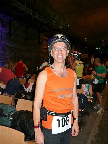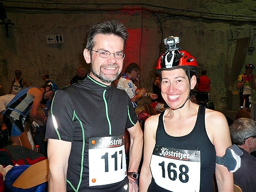 Angälika und Äberhard halten drei Wochen Marathonpause auch für das maximal Zumutbare und scharren schon mit den Hufen. Beide sind extrem untertageerfahren und hier auch schon zum wiederholten Male dabei. Wenn das kein Qualitätsmerkmal für diesen Lauf ist! Sie haben heute eine Schock-Anfahrt hinter sich: Eine Dreiviertelstunde hinter Stuttgart ging Angälika ein Licht auf. Das soll, insbesondere bei Frauen, ja manchmal nicht schaden, hier aber war es eher unangenehm. Es war nämlich das der Kontrolleuchte für Kühlwassermangel. Äberhard, ganz Mann der Technik und Tat, will darauf den reichhaltigen (Trink)Wasservorrat plündern und nachfüllen, aber ohne Erfolg. Also wieder 45 min zurück und in Äberhards Panda im Tiefflug gen Thüringen. Resultat: Mit der letzten Fahrt gerade noch so untertage gekommen und zwei wunderhübsche Portraits, wohlgeblitzt, sind im Zulauf.