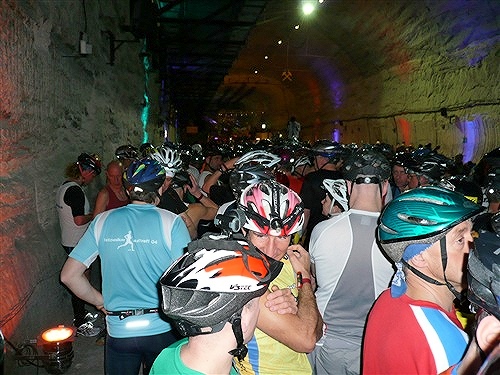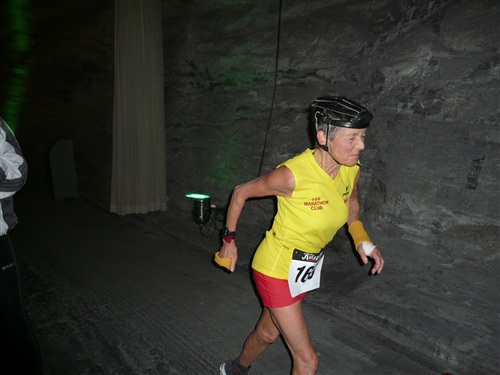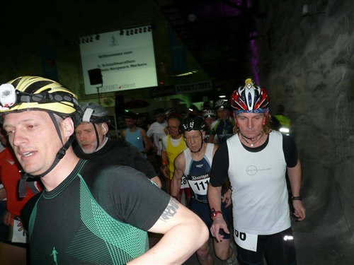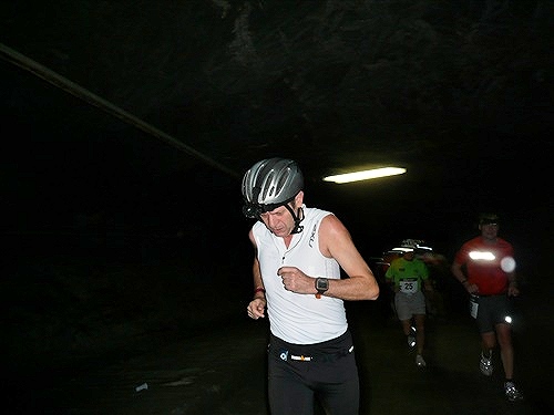 Die Strecke bietet des weiteren eine kurze Begegnungsstrecke und einen Wendepunkt, wo man sich kurz sehen kann. Sogar eine feste Toilettenanlage ist unterwegs vorhanden. Keine stillen und dunklen Nebenstollen, wie in Sondershausen, wo man mal eben abbiegen kann... Die zweite Hälfte besticht u.a. durch eine sehr lange Gerade, die eine gleichmäßige, von Runde zu Runde heftiger werdende Steigung bietet. Nach dem Scheitelpunkt stürzt der Weg 15prozentig in die Tiefe. Nichts ist mit Laufen lassen, auch hier muß zum Abbremsen wieder Kraft investiert werden. Km-Schilder fehlen (wofür auch?) und so kann ich meine Zeit erst beim ersten Zieldurchlauf checken. 17:33 min. ist sehr flott, aber irgendwie bekomme ich die Bremse (noch) nicht richtig gezogen. Das aber, seid gewiss, wird noch kommen. Und zwar nachhaltigst. Denn wer zu schnell läuft, den bestraft die Strecke.