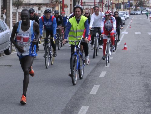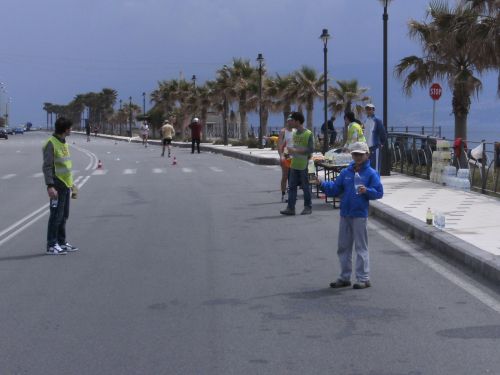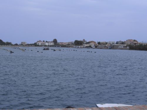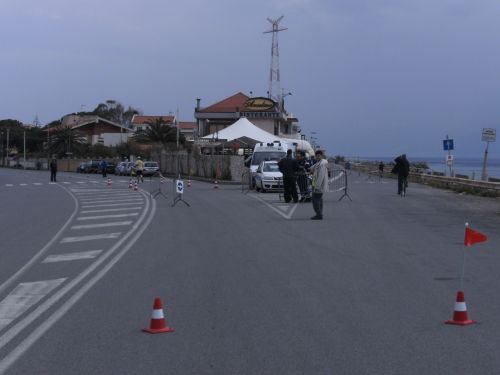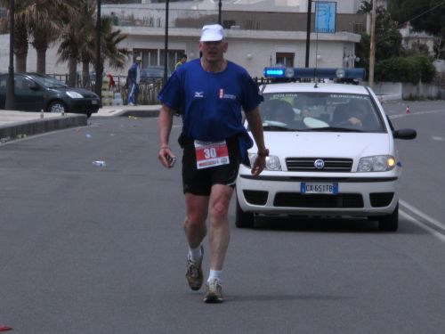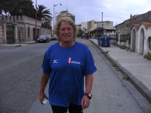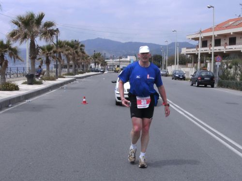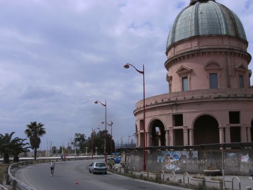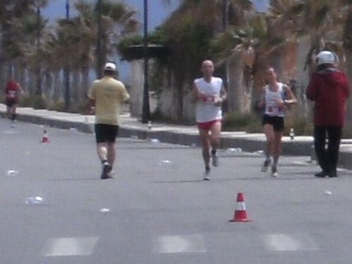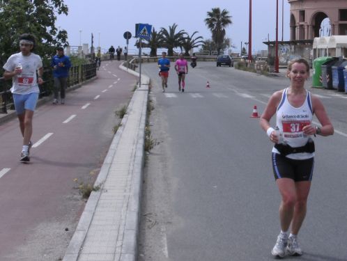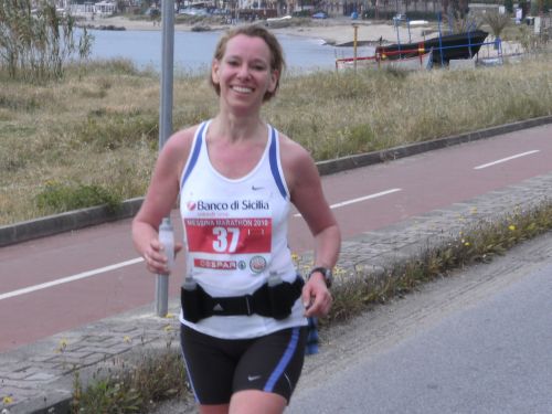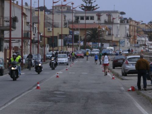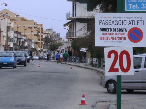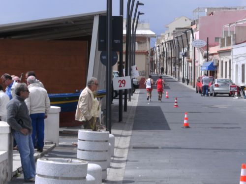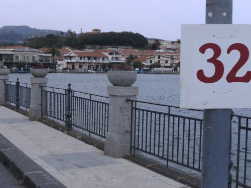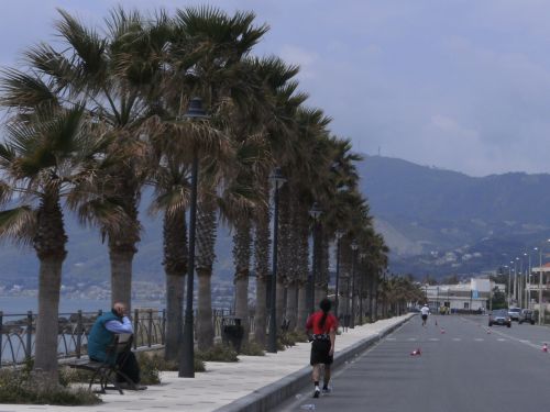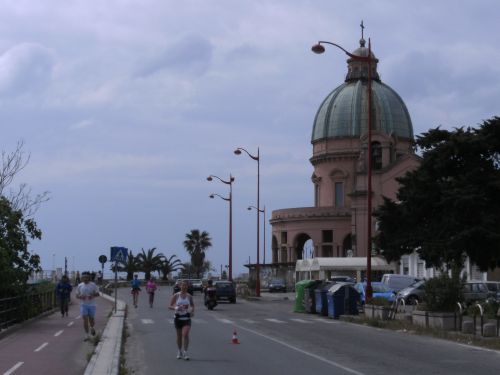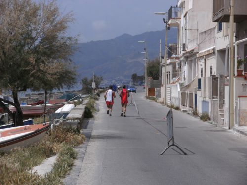 Wir laufen nun den schönsten Teil der Strecke. In Ganzirri geht es links entlang eines schönen Sees und wenig später folgt ein zweiter kleinerer See. Den großen Turm am Stretto di Messina, so nennt man die Meerenge, sehen wir schon einige Zeit. Er kommt langsam näher. Wird auch Zeit, bei KM 28 sind ja erst zwei Drittel des Marathons geschafft.