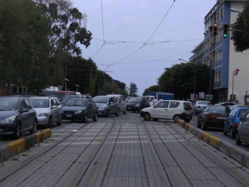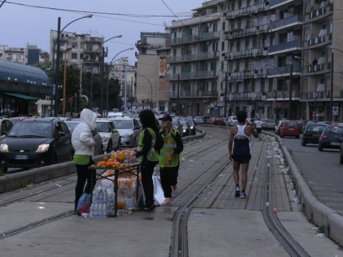 Zu Hilfe kommt mir der aufkommende Verkehr und eine kurzer Nieselregen nach KM 34. Wieder in Messina angekommen, sind plötzlich Autos direkt vor uns auf der Strecke. Ein Fahrzeug will unmittelbar vor mir von rechts nach links. Ein energisches Brüllen meinerseits verschafft mir notwendiges Adrenalin und hält den Weg frei. Ich bin froh, wieder auf den Straßenbahngleisen laufen zu können. Hier fahren wenigstens keine Autos. Die stauen sich aber jeweils zweispurig links und rechts und stinken.