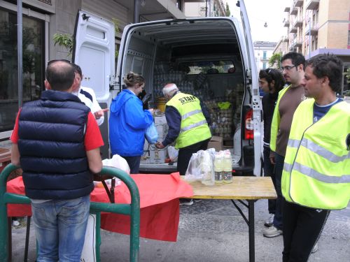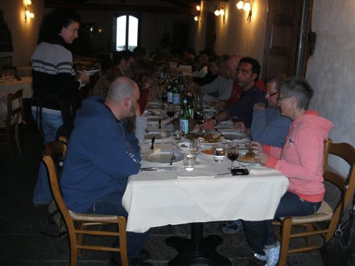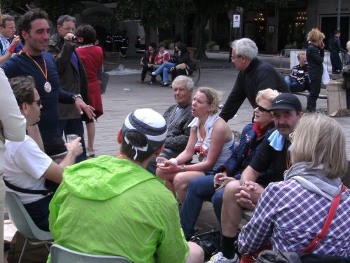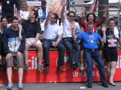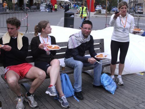 Ausgestattet mit dem Verpflegungsbeutel gehe ich zum Stimmungsnest und geniesse mit den anderen die Stimmung. Irgendwie schade, aber der Lauf ist zu Ende. Wir treffen uns zum Abschluß noch einmal alle auf der Piazza Cairoli und lösen unsere Pasta-Bons ein. Auf der Bühne machen wir noch unsere private Siegerfotos und feiern Willem und Annemarie als Finisher.