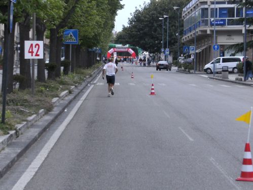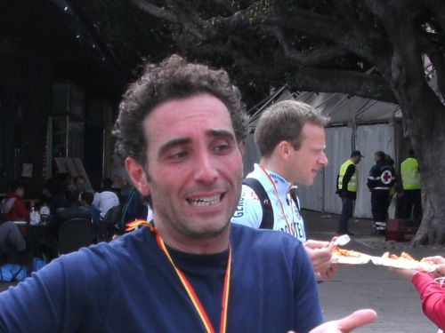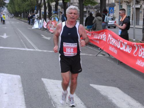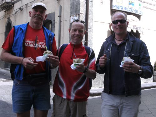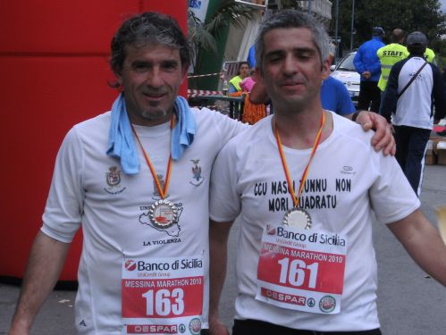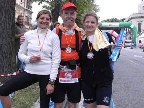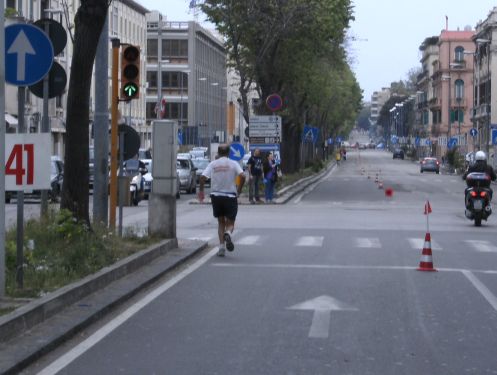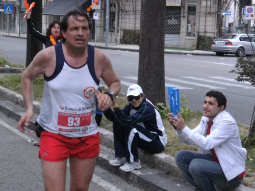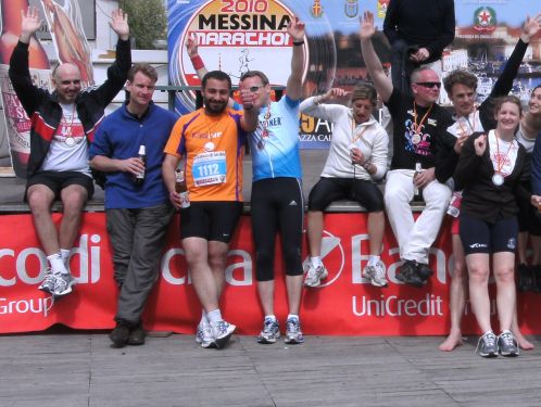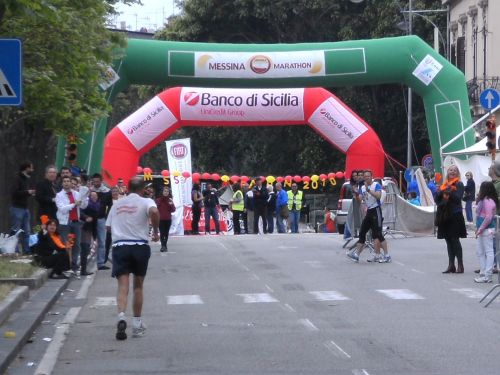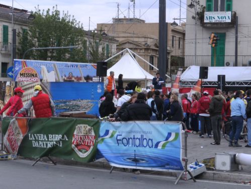 Selten habe ich mich so auf eine kleine Steigung gefreut wie auf das letzte Stück der Strecke in Messina hinauf zur Piazza Cairoli. Doch was ist das? Unmittelbar vor dem Ziel steht wieder das deutsch-italienische Stimmungsnest, verstärkt um die stolzen "Halben" Alessandra, Margherita und Luca. Die machen ordentlich Stimmung und feiern jeden, der ins Ziel kommt.
