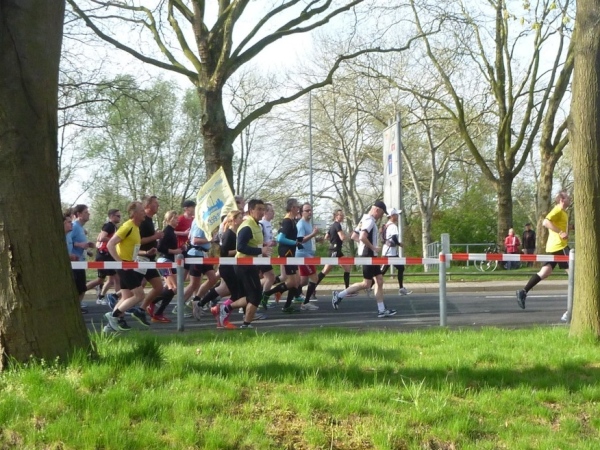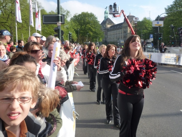 Start zum Marathon - Die Cheerleader sehen nur die Läufer in der ersten Reihe. Die Cecilienallee ist sehr breit, sodass wir zügig und ohne Gedränge loslaufen können. Die Bäume an der Straße sind in Düsseldorf schon frühsommerlich grün, die Kirschblüte ist in vollem Gange.