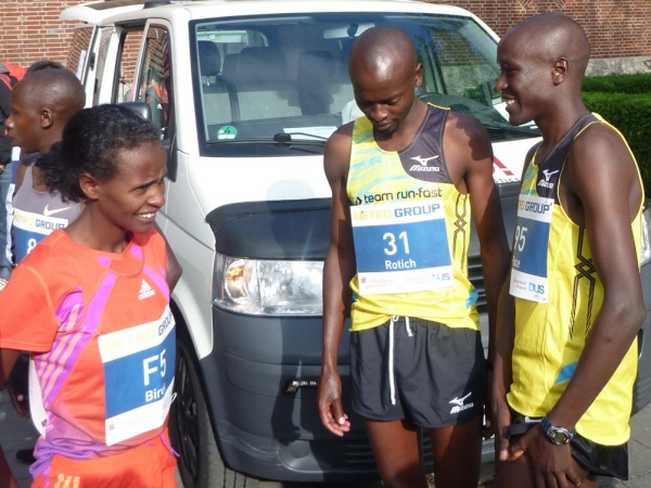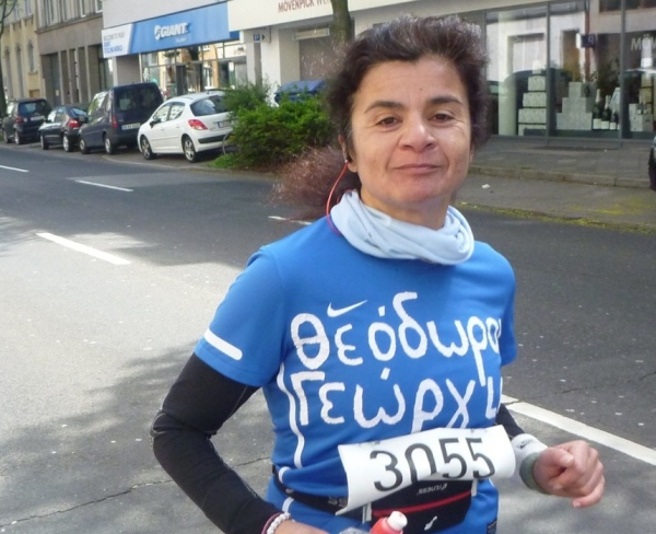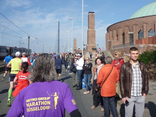 Bei km 9 kommen wir am schönen Schloss Jägerhof vorbei. Wir laufen an tempelartigen Gebäuden vorbei, bei denen es sich um das klassizistische „Ratinger Tor“ handelt. Jetzt geht es auf die Oberkasseler Rheinbrücke. Hier an der Tonhalle feuern uns natürlich besonders viele Zuschauer an. Kein Wunder, liegen doch Start und Ziel gleich in der Nähe. Es geht zum linksrheinischen Stadtteil Oberkassel. Auf der Brücke kommt uns die Spitzengruppe der Männer entgegen, kurze Zeit später auch die führende Läuferin.