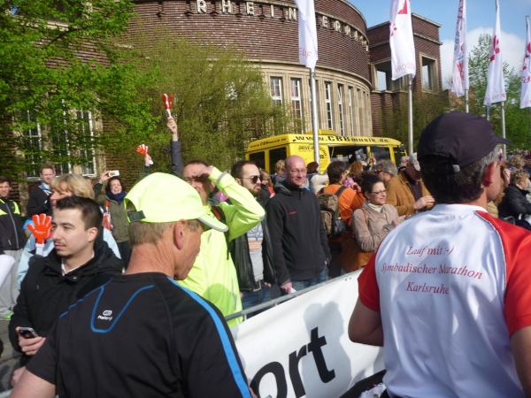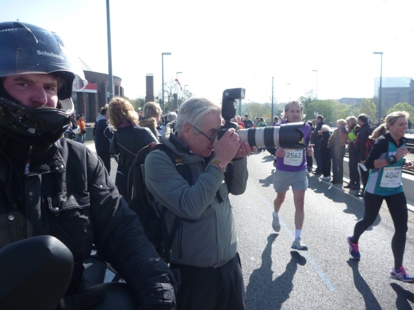 Von Judith komme ich das Okay, ein wenig schneller zu laufen. Sie selbst möchte die Stimmung anscheinend noch ausgiebiger genießen. Beim Humboldt-Gymnasium dann Musikanten in Aktion. Die Big-Band macht super Stimmung. Toll, dass mich viele Zuschauer beim Namen kennen (steht groß auf der Startnummer). Aber warum nur gratuliert mir keiner zum Geburtstag? Bis zum 50. Marathon am 50. bleiben mir noch 24 Monate und 13 Marathons. Ist doch machbar.