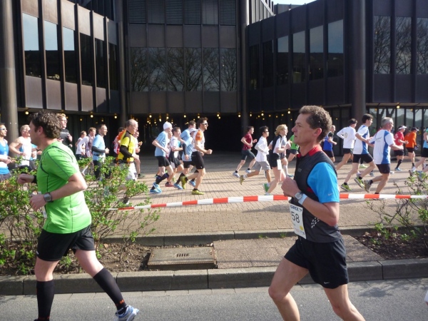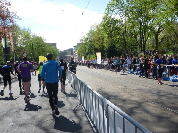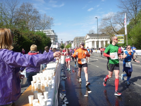 Wir stoßen auf Joe K. Ich hätte mich gerne ein wenig über seine Wüsten-,  Schnee- und sonstigen Läufe unterhalten. Aber da bin ich nicht der einzige und so lasse ich ihn lieber mit der Blonden allein. Die Rotterdamer Straße führt rheinabwärts in Richtung Flughafen. Am Messegelände geht es nach rechts in die Vorstadt. Am Nordpark kommen wir zum Aquazoo mit der ersten Verpflegungsstelle. Die ist wie alle anderen ausreichend groß und gut bestückt. Erst erhalten wir Wasser, später immer wieder auch Iso-Getränke und Bananen. Ab km 26 gibt es auch drei Stände mit Gel und Cola. Nette Helferinnen und Helfer versorgen uns bestens.