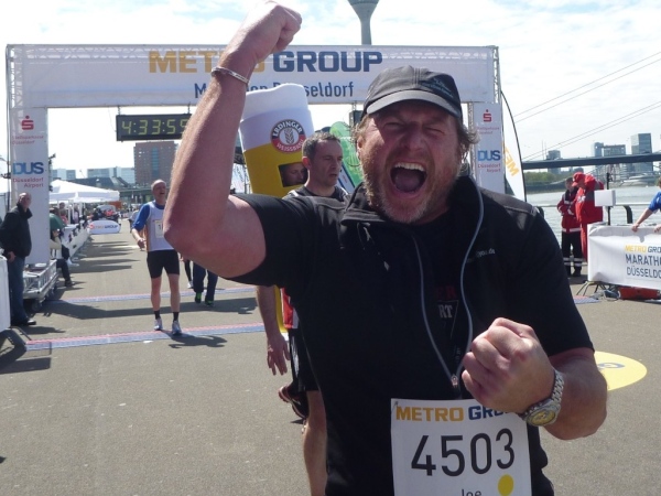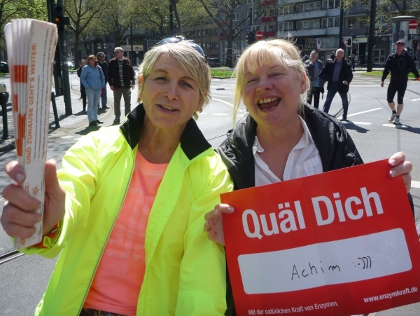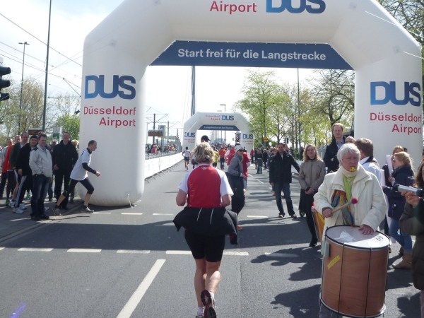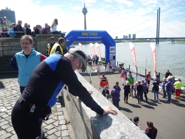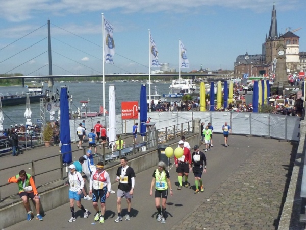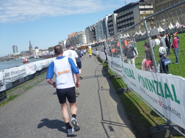 Am Rhein sehen wir wunderschöne Häuser und wieder frage ich Judith, was wir falsch gemacht haben und wir nicht so wohnen. Na ja, für ein paar schöne Marathonreisen reicht es aber. Scheint eine teure Wohngegend in Düsseldorf zu sein. Von den Balkonen werden wir angefeuert. Eine Dame malträtiert ihr gutes Kochgeschirr.