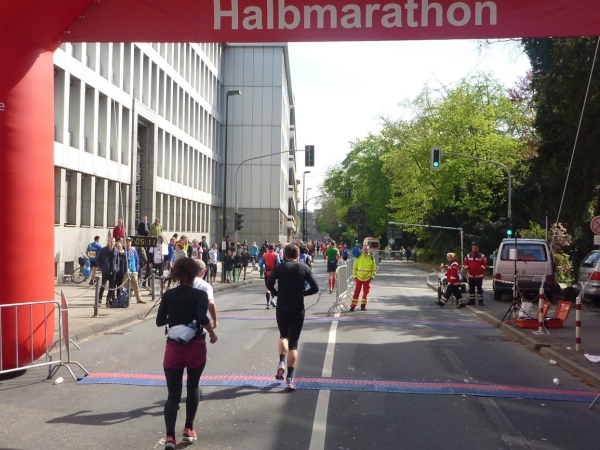Toller Zieleinlauf vor der Rheinuferpromenade. Knapp nach den Vier-Stunden-Läufern kommt Judith ins Ziel. Sie hatte sich zwischenzeitlich wieder erholt, aber zum Aufholen war die Zeit zu knapp. Viele Zuschauer und hinter dem Zielbereich viele Sonntags-Bruncher in den Kasematten.