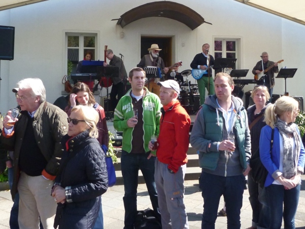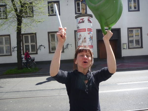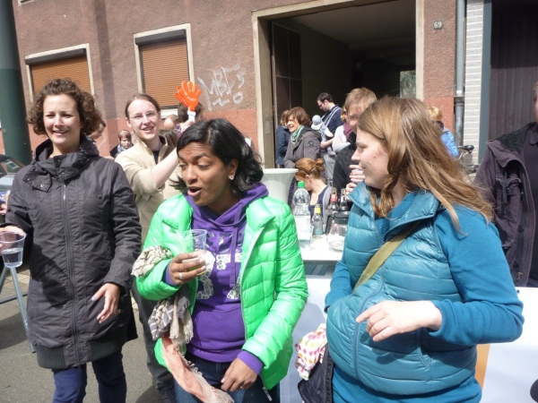 Wir machen einen Schlenker, wahrscheinlich nur um bei der nächsten großen Party vorbeizuschauen. Wahnsinn, was da los ist.  Die Bewohner haben eigens ein Transparent zur Begrüßung über die Straße gespannt und sorgen für Stimmung, dazu viele Samba-Trommler und Bands. Am Brehmplatz fällt mir eine Familie auf, die eine kleine Verpflegungsstelle betreibt. Die Töchter sind voll bei der Sache. Leider komme ich nicht dazu, mir eine Haselnussschnitte zu greifen. Bin in Eile und auch irgendwie gerührt.