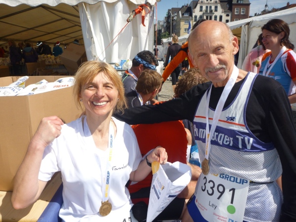 Ich gerate über diesen phänomenalen Stadtmarathon mit der fantastischen Stimmung so richtig ins ins Schwärmen. Wir sitzen in der warmen Sonne. Das Läuferpärchen, mit dem wir uns unterhalten, kommt aus Düsseldorf und freut sich sehr über unser Lob.