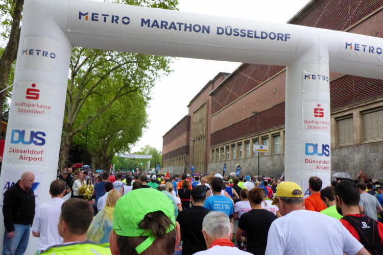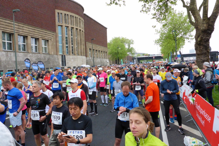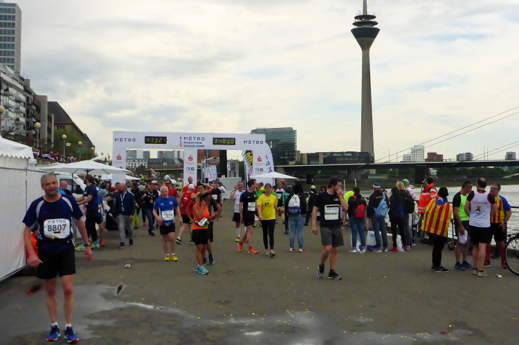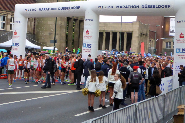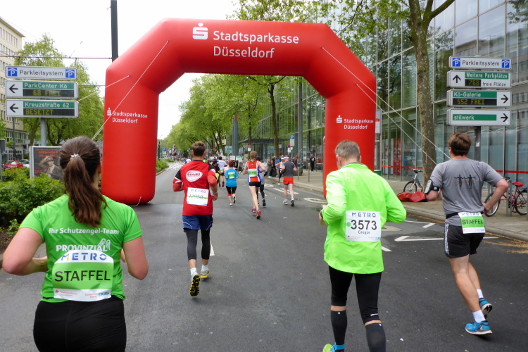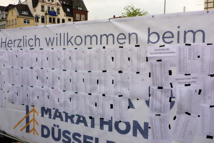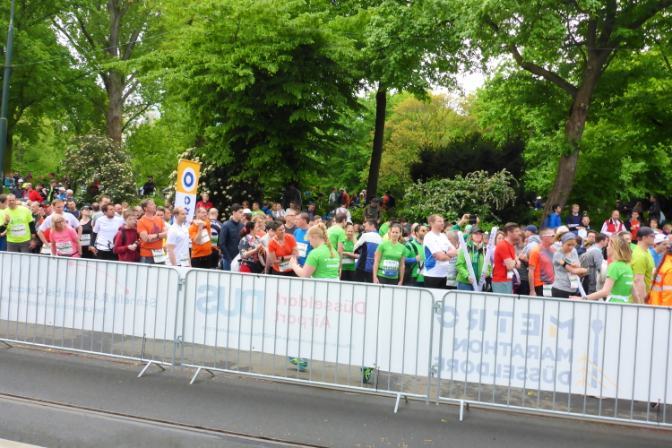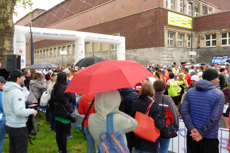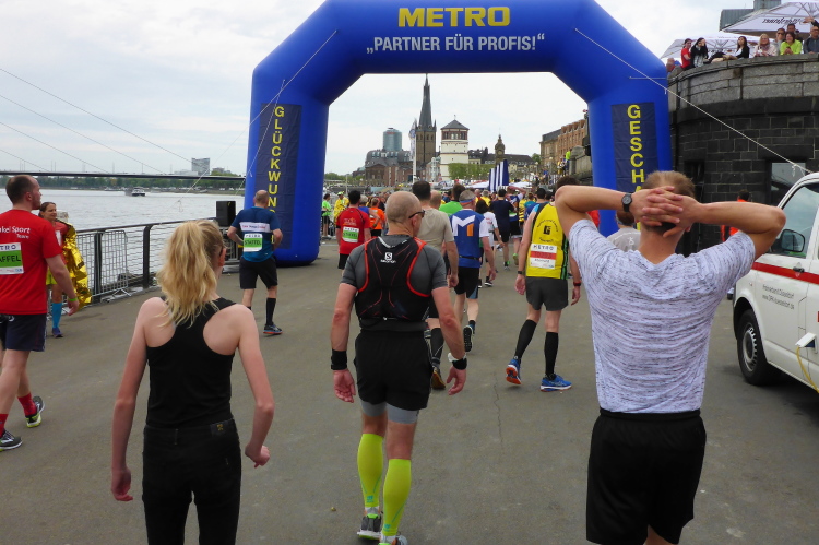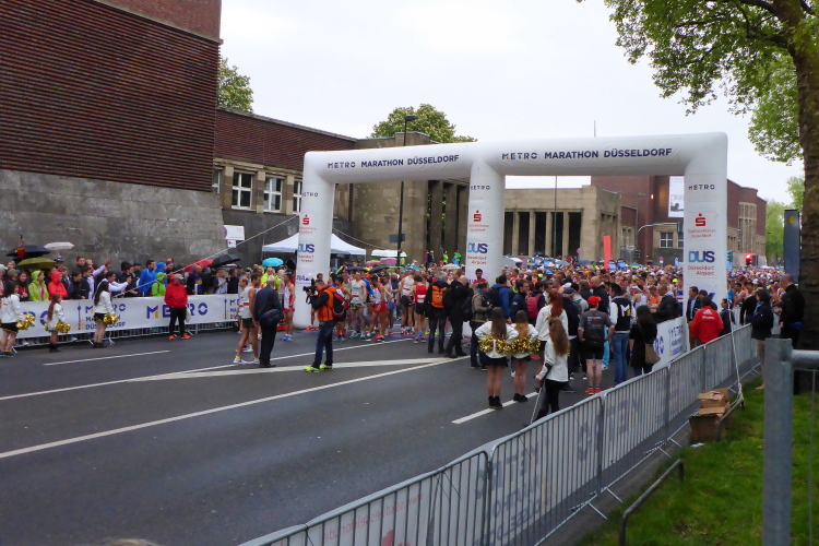 Vor dem Lauf kann man sich seine Startnummer noch am Burgplatz abholen. Erkennen kann man den Platz am Schlossturm. Es ist der Rest des Düsseldorfer Schlosses, das im 13. Jahrhundert vom Grafen von Berg auf einer Mündungsinsel der Düssel erbaut wurde. Nicht die Düssel, sondern ein Brand hat das Schloss 1872 zerstört. Die Düssel, es gibt derer vier im Stadtgebiet, mündet in einem Rohr direkt unterhalb des Schlossturmes.