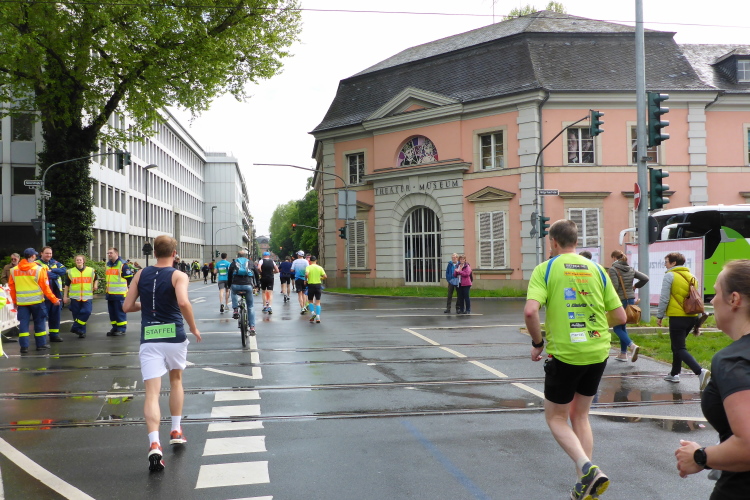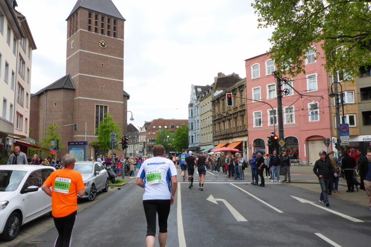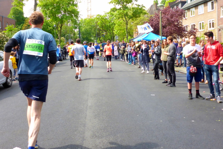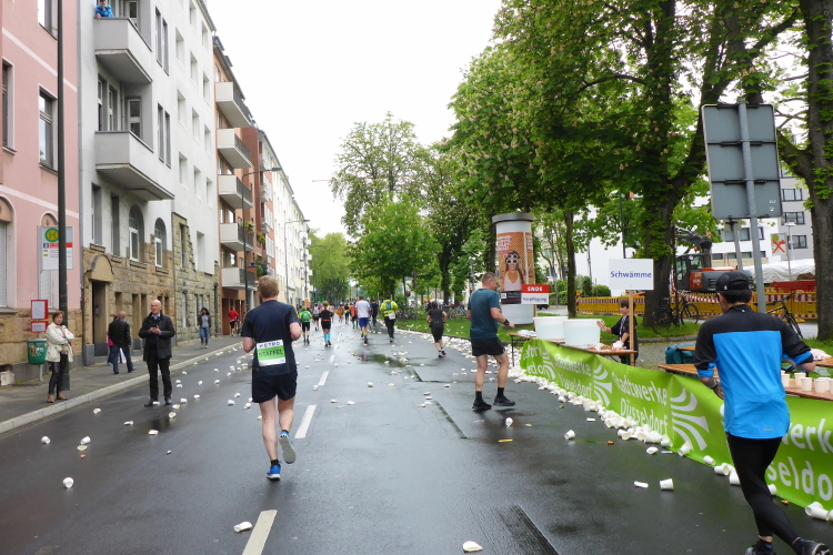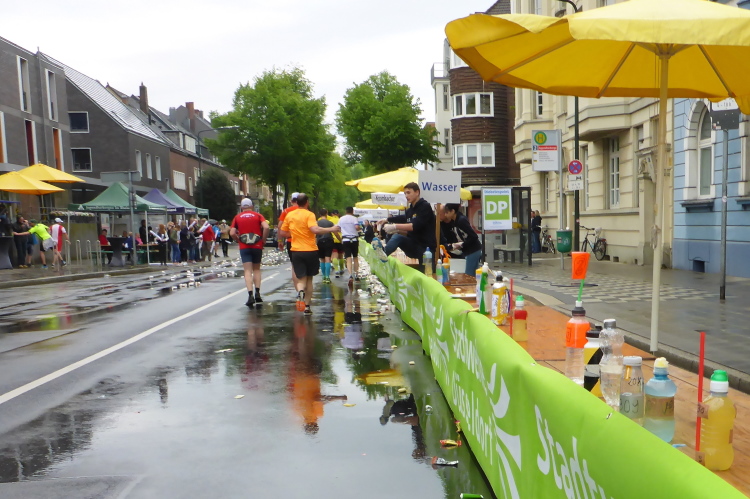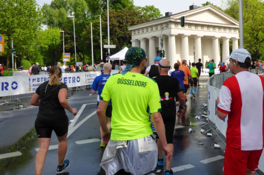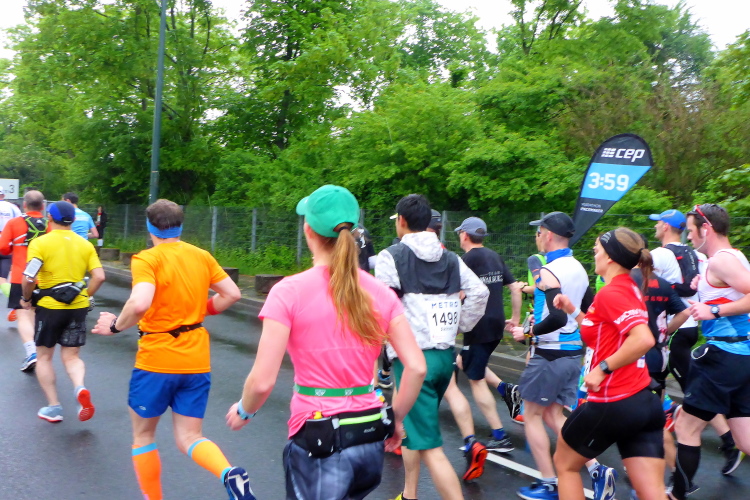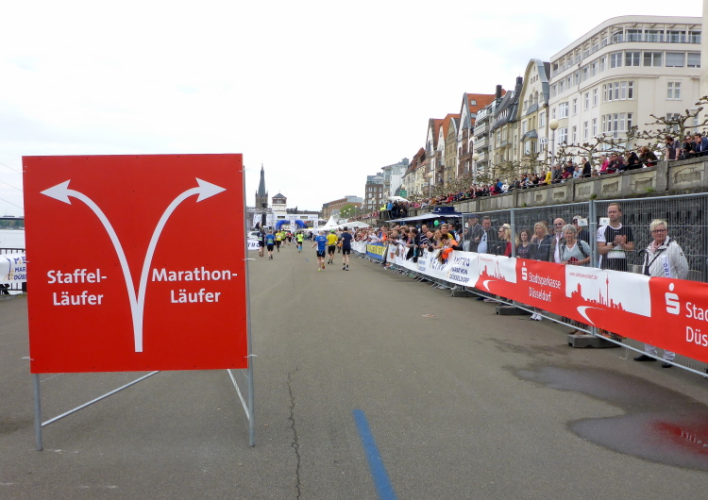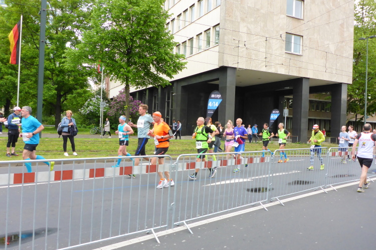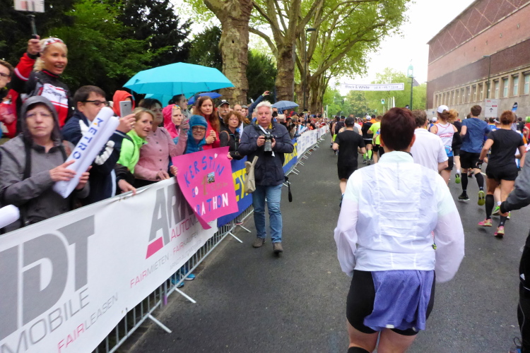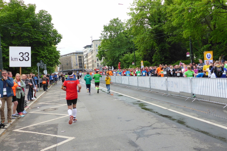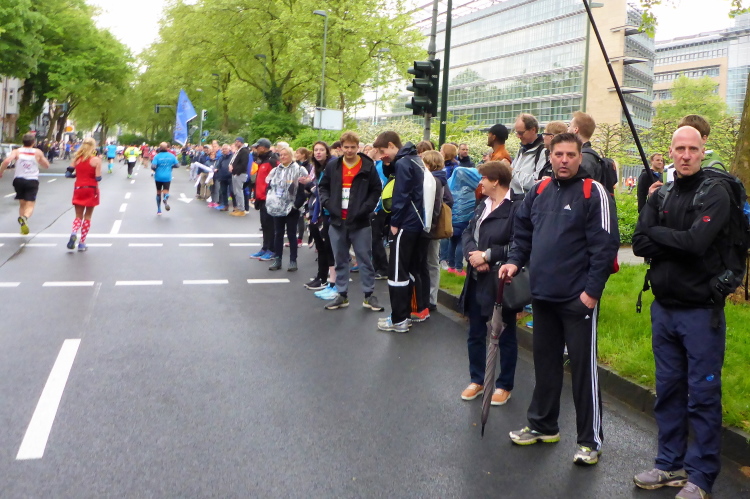Mensch, vor 10 Jahren konnte ich es mir leisten, von den Zuschauern ein paar Bierchen zu leihen, war trotzdem eine Stunde schneller als heute. Die Verpflegungsstationen sind gut bestückt und lang aufgestellt, so dass es kein Gedränge gibt. Immer mehr Staffelläufer kommen von hinten, sie sind später gestartet. An den gut von der Marathonstrecke abgesperrten Wechselstationen staune ich über die schiere Masse der Staffelläufer, und doch hat mich noch keiner in meinem Lauf behindert. Die einweisenden Ordner sind auf Zack: Staffelläufer in die eine Gasse, Marathonläufer in die andere.