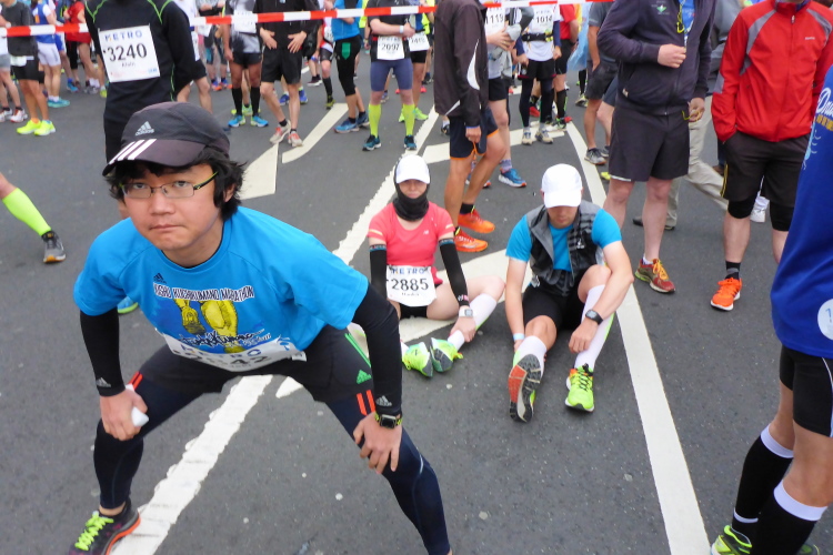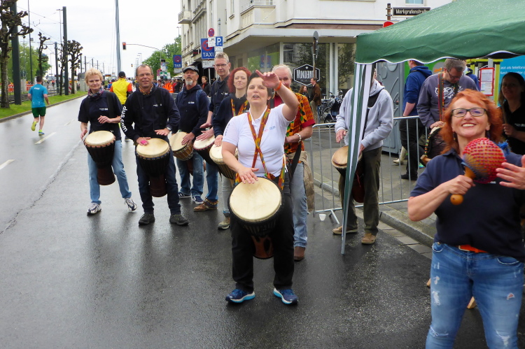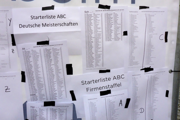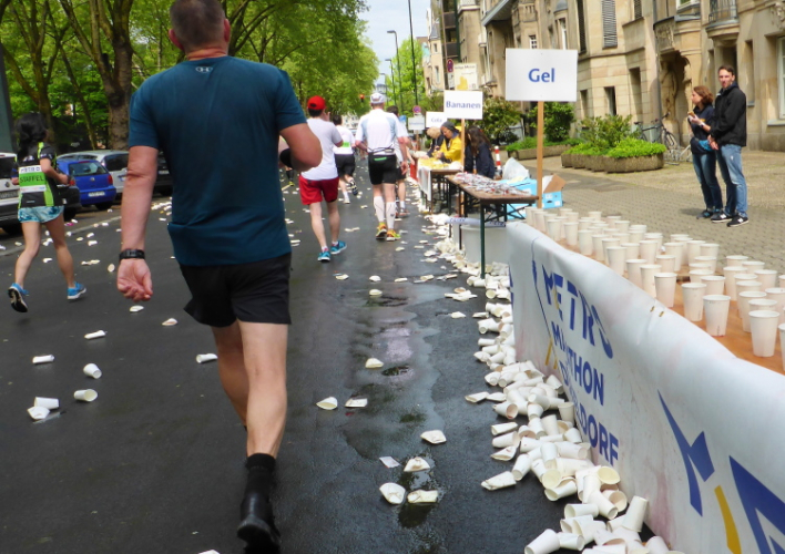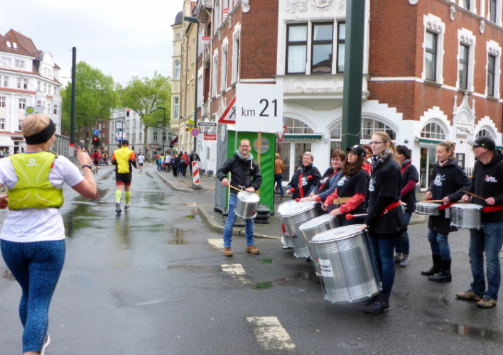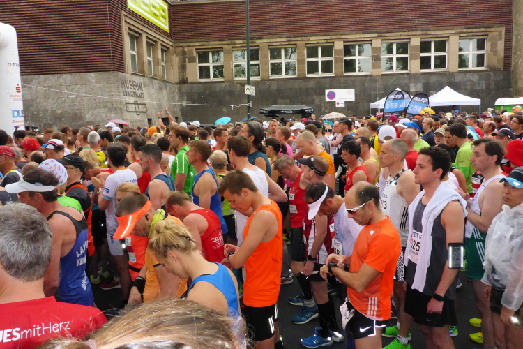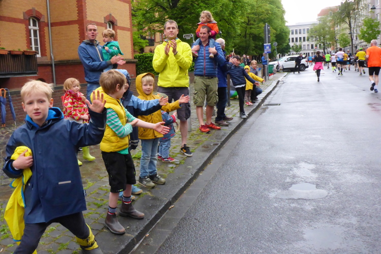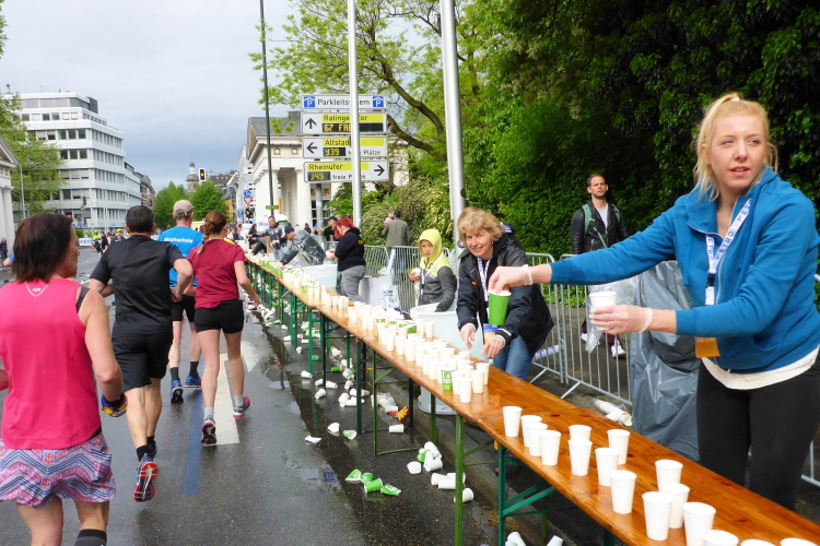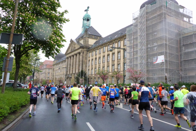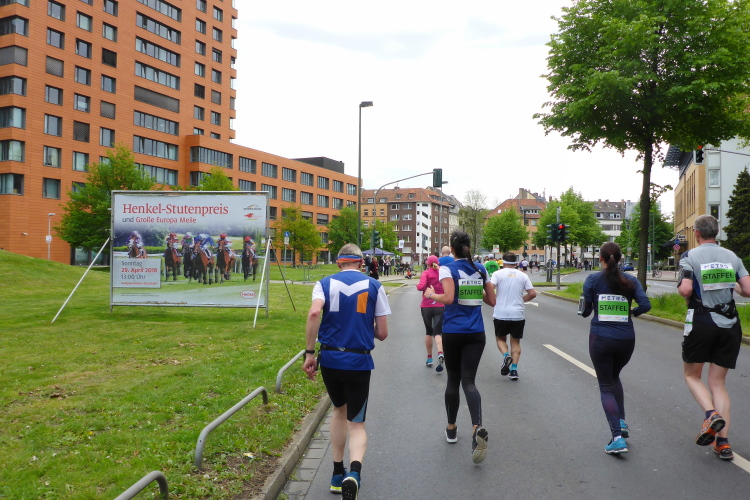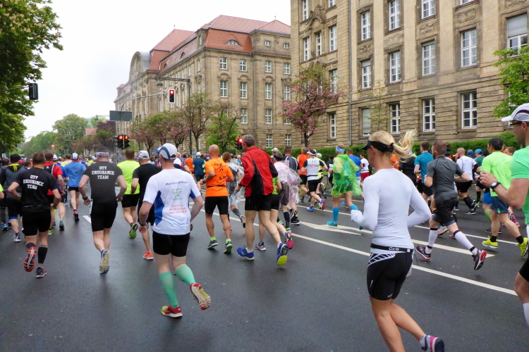 Mensch, vor 10 Jahren konnte ich es mir leisten, von den Zuschauern ein paar Bierchen zu leihen, war trotzdem eine Stunde schneller als heute. Die Verpflegungsstationen sind gut bestückt und lang aufgestellt, so dass es kein Gedränge gibt. Immer mehr Staffelläufer kommen von hinten, sie sind später gestartet. An den gut von der Marathonstrecke abgesperrten Wechselstationen staune ich über die schiere Masse der Staffelläufer, und doch hat mich noch keiner in meinem Lauf behindert. Die einweisenden Ordner sind auf Zack: Staffelläufer in die eine Gasse, Marathonläufer in die andere.