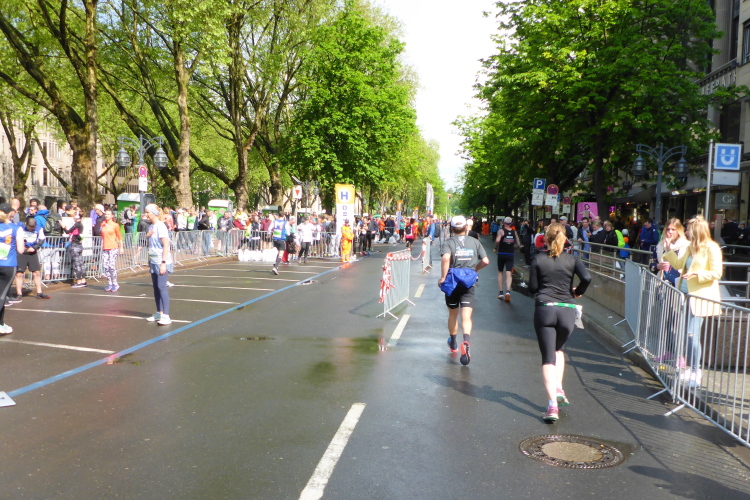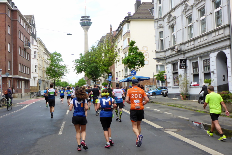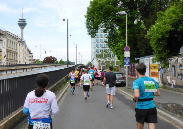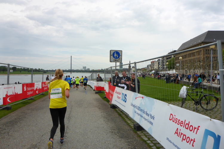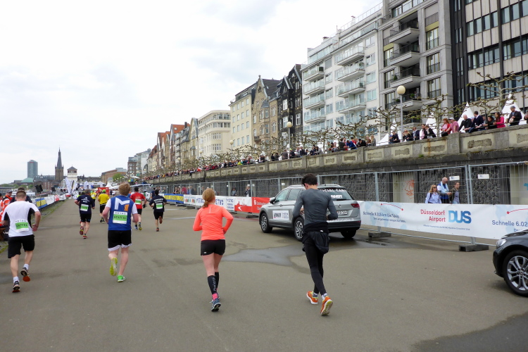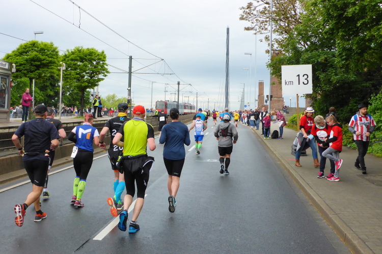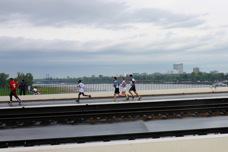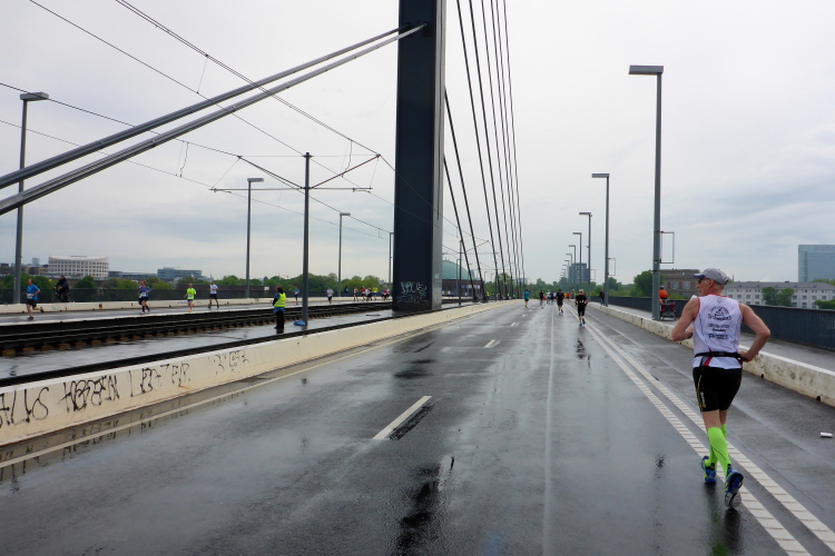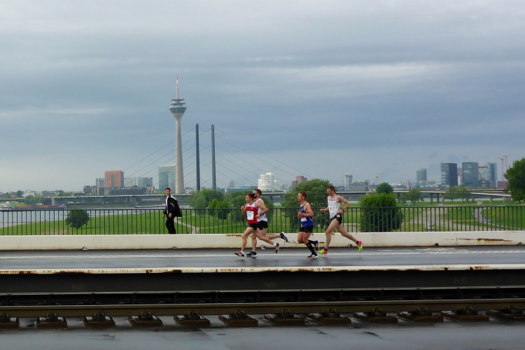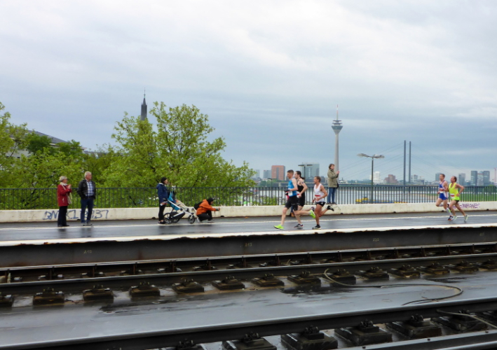 Nach dem Abstecher Richtung Derendorf, geht es bei km 12 hinauf zur Oberkasseler Brücke. 30 Höhenmeter muss man beim Düsseldorf Marathon insgesamt überwinden, ich werde nächste Woche 12.000 überwinden, wenn ich den Trans Atlas Marathon laufe. Auf der Gegenseite flitzen die Spitzenläufer vorbei. Die haben einen fantastischen Laufstil.
