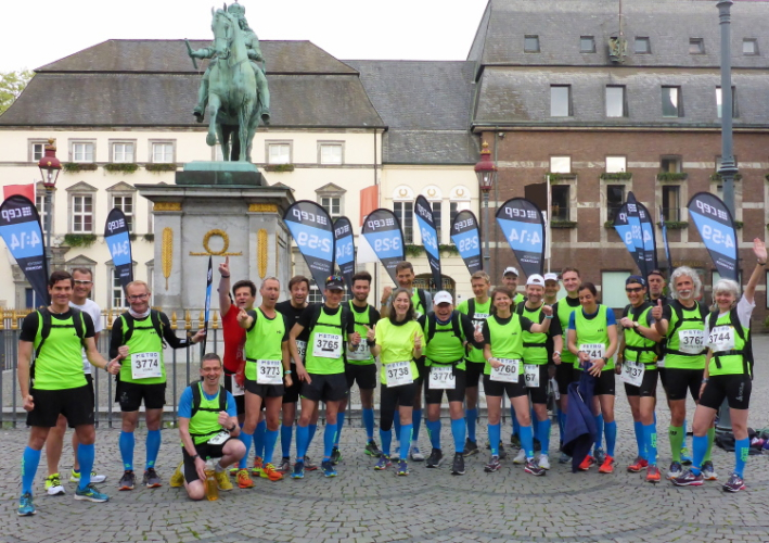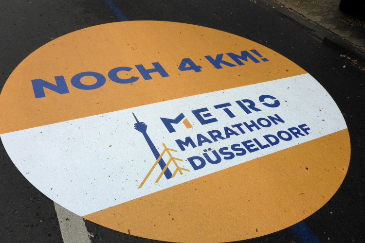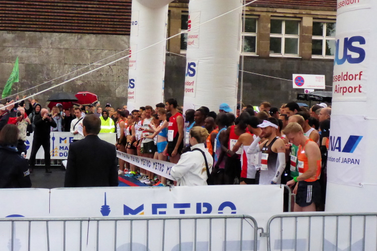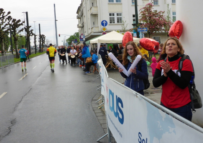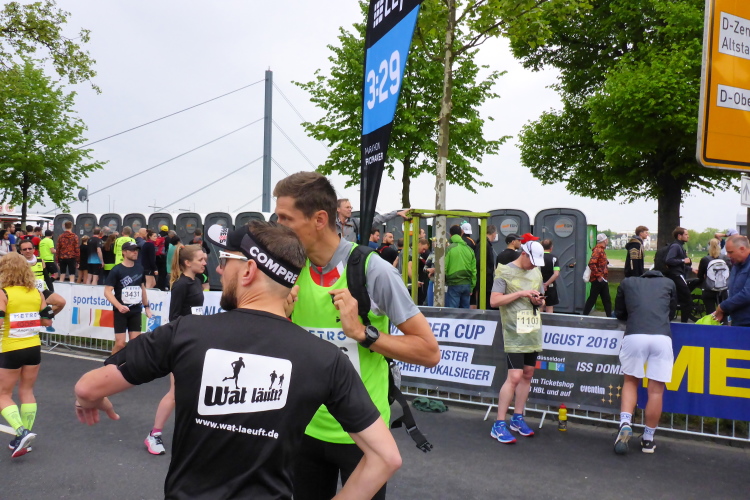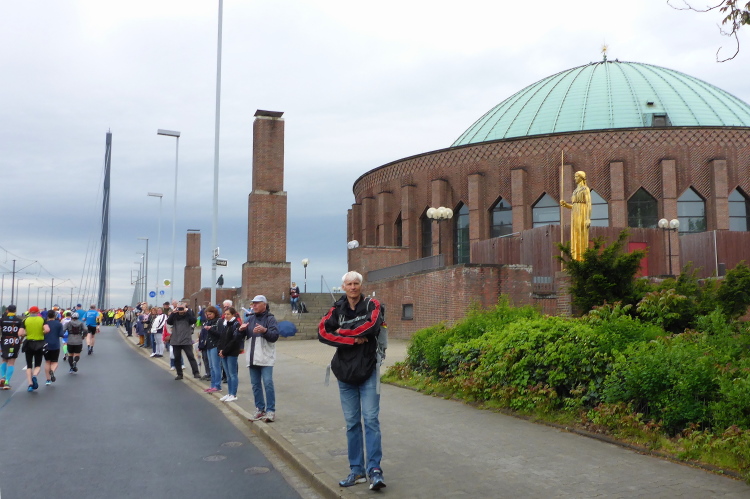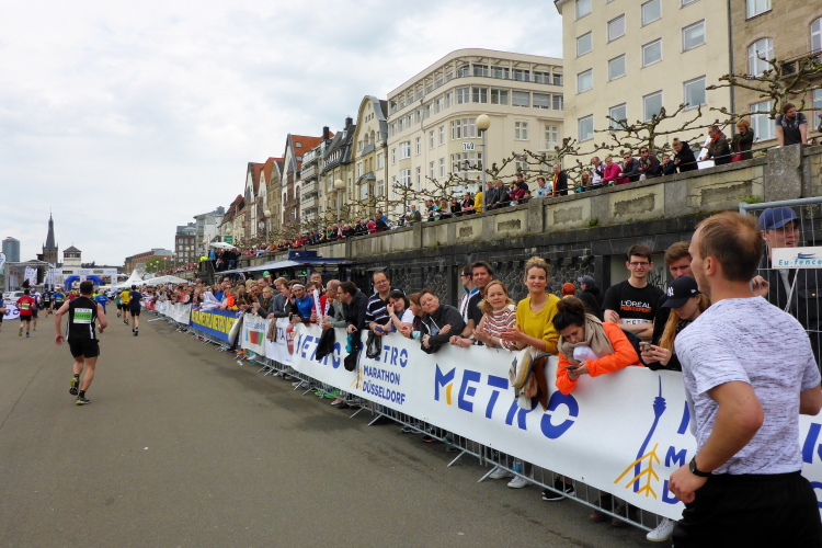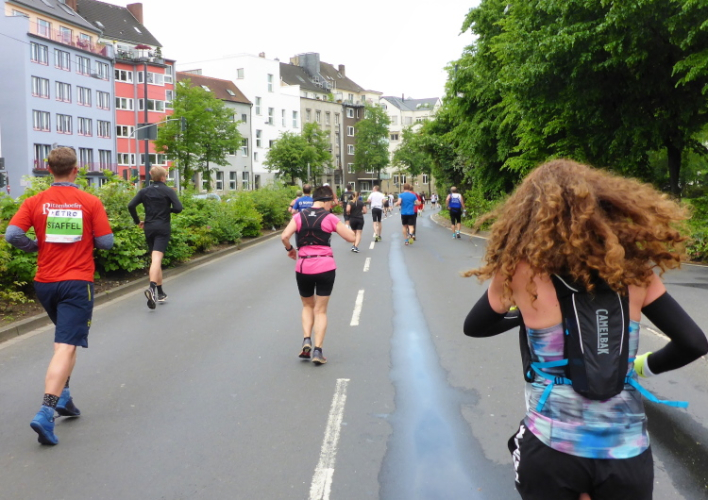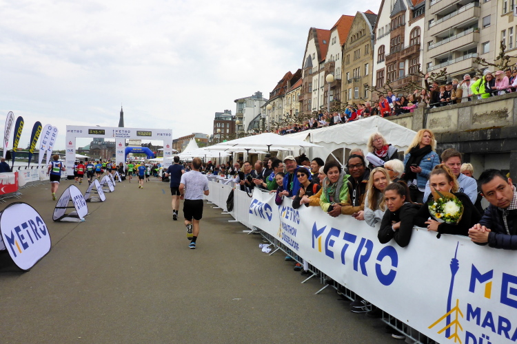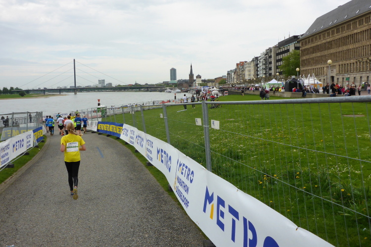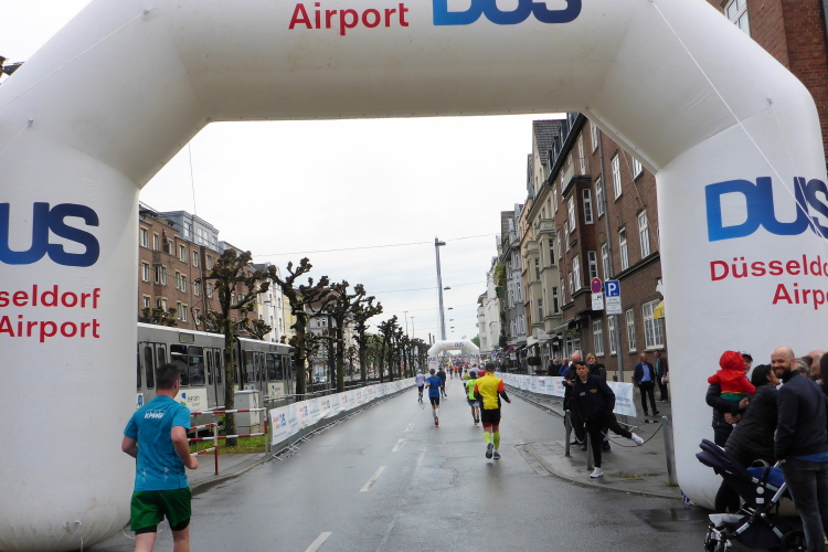 Nach dem Abstecher Richtung Derendorf, geht es bei km 12 hinauf zur Oberkasseler Brücke. 30 Höhenmeter muss man beim Düsseldorf Marathon insgesamt überwinden, ich werde nächste Woche 12.000 überwinden, wenn ich den Trans Atlas Marathon laufe. Auf der Gegenseite flitzen die Spitzenläufer vorbei. Die haben einen fantastischen Laufstil.