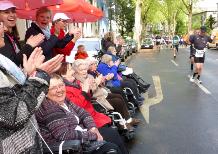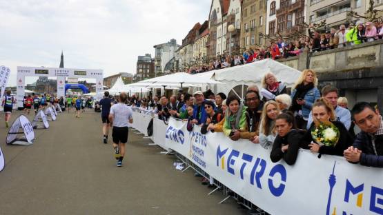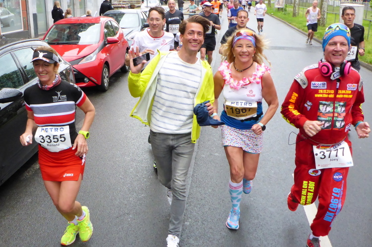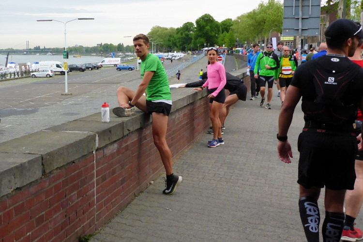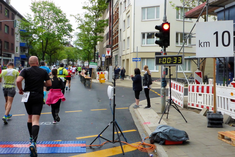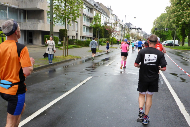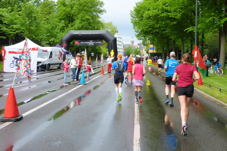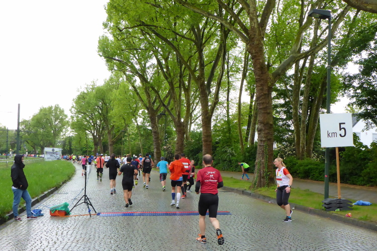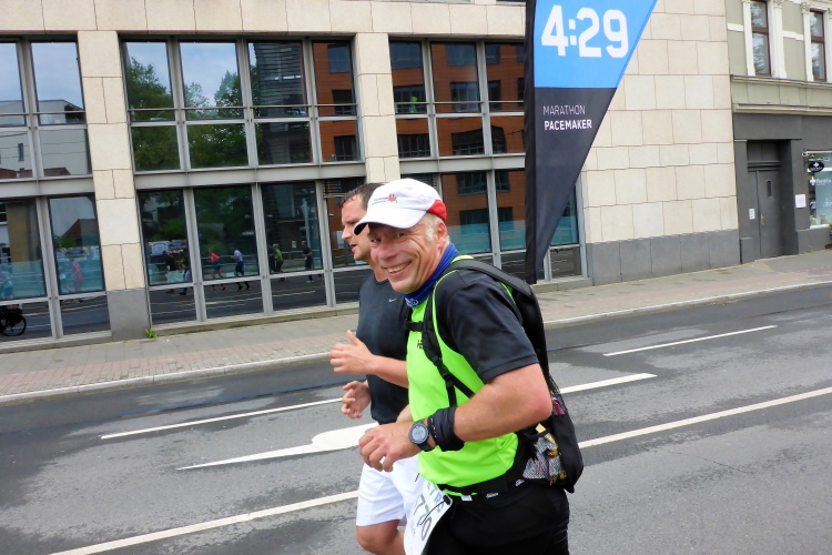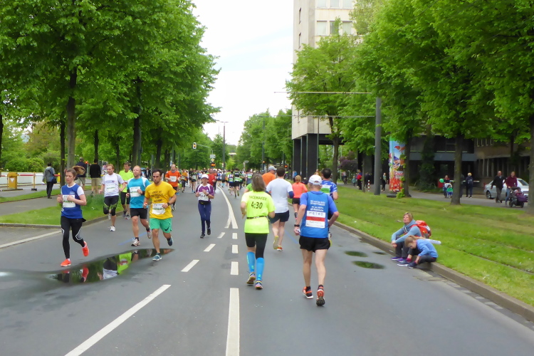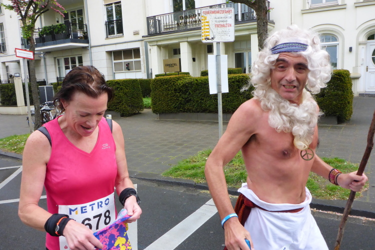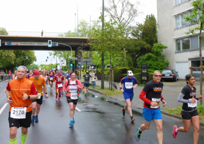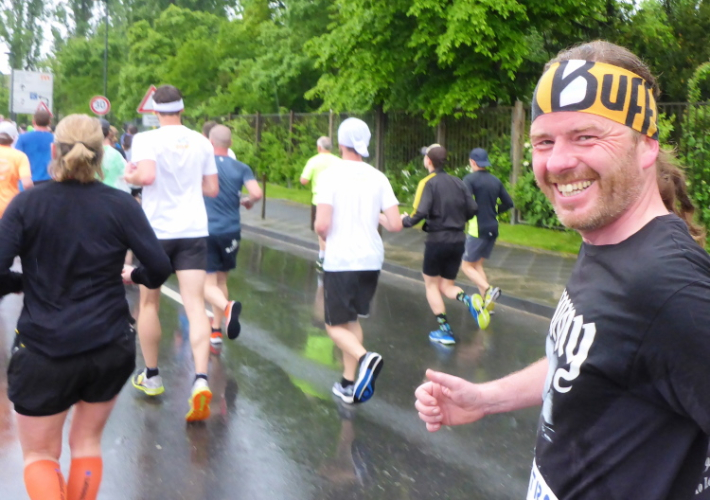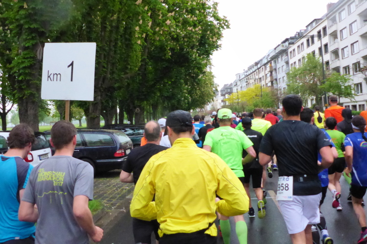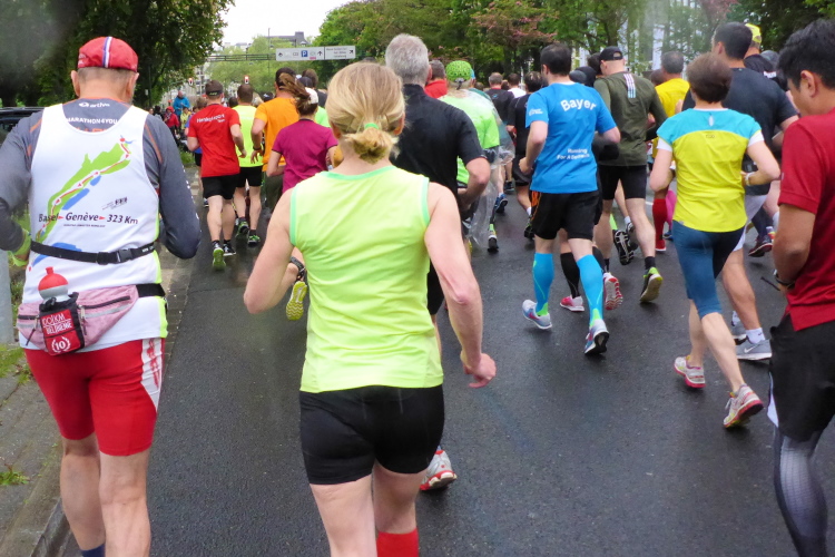 Lustig ist auch Dan aus Lothringen, der jedes Wochenende einen Marathon als Moses verkleidet läuft. Die Zuschauer sind begeistert von ihm. Ansonsten sehe ich keine verkleideten Läufer, und potentielle Zuschauer lassen sich zunächst vom Regen abschrecken. An der 10 Kilometermarke sehe ich, dass ich heute schnell bin. Keine 40 Minuten, wie früher, aber eine wacklige Eins steht da. Werde ich das Tempo auf 42 Kilometern halten können?