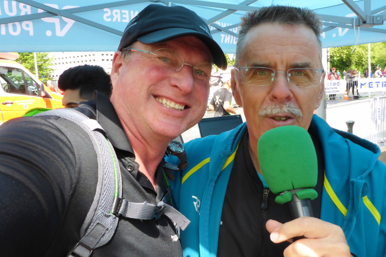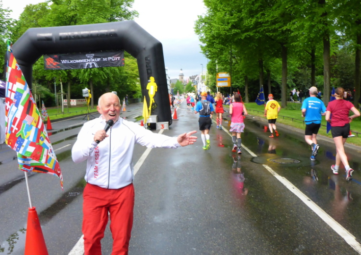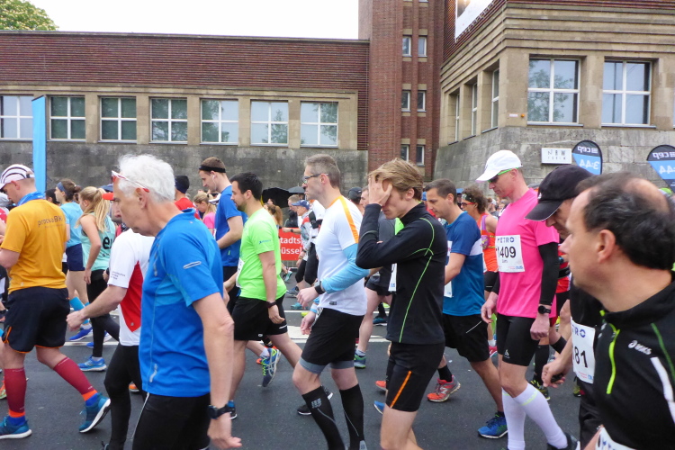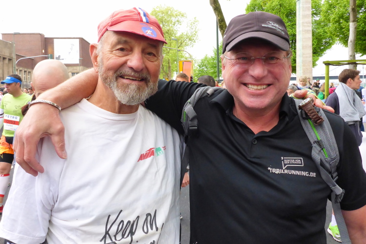 Radschläger gibt es am Startgelände nicht, und auch sonst keine Aufgeregtheit. Gut, es finden hier zum fünften Mal die Deutschen Meisterschaften satt, aber nach vorne, dort, wo die sich nun tummeln, schaff ich es nicht mehr. Startschuss. Es gibt kein Gedränge, keine nervigen Staffelläufer, nichts, was mich stört. Innerhalb einer Minute bin ich über der Startlinie und kann frei laufen. Ein Foto von Wilhelm Mütze, der heute seinen 1800ten Mara/Ultra läuft und von Karl-Ernst Rösner, der seinen 507ten läuft, er ist gerade 80 geworden.