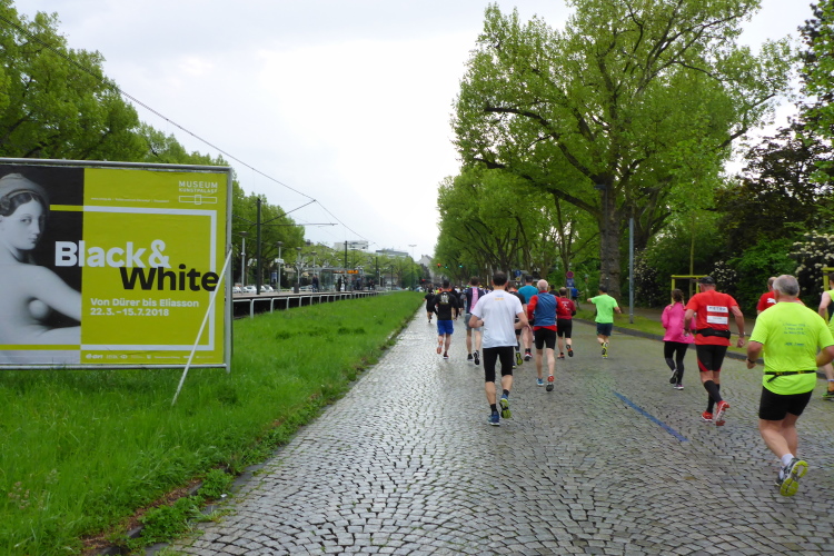 Vorbei geht es an der Oper und dem nördlichen Teil der Königsallee. Bei km 25 laufen wir am Hofgarten vorbei, einst Residenz von Fürsten und Herzögen. Den Bau des Parks finanzierte Wilhelm der Reiche, was ich erwähne, weil der Name so cool ist. Der seltsame Berg geht auf Napoleon zurück. Er „schenkte“ den Bürgern den Park und ließ die Teiche ausheben, die von der nördliche Düssel durchflossen werden. Übrigens wird das Neandertal nicht von der Neander, sondern von der Düssel durchflossen. Es wird nur so genannt, weil der Herr Neander dort mal einen Knochen fand.