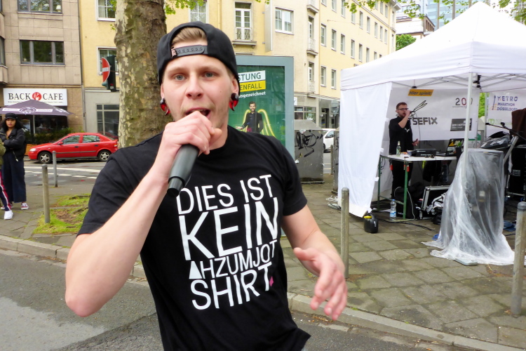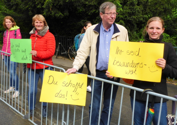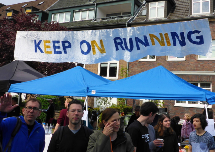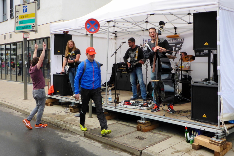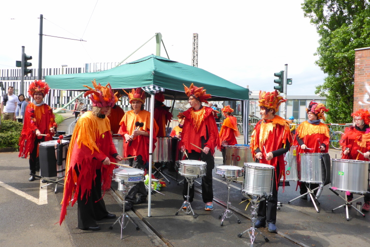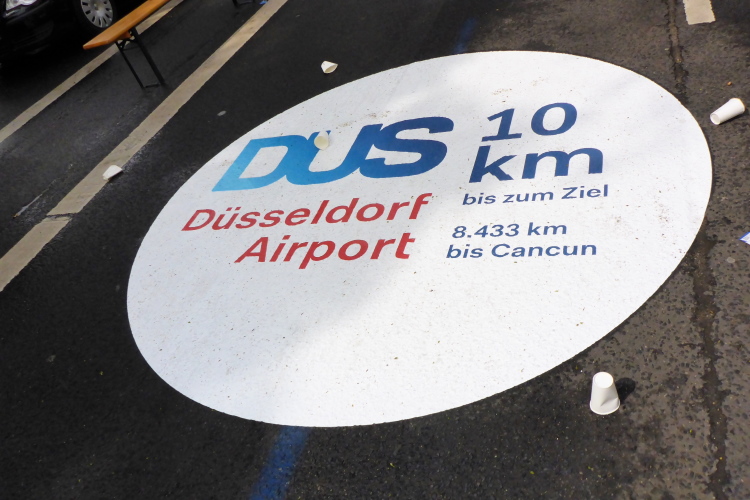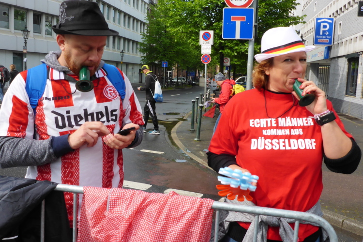 Am Eisstadion vorbei geht es in die Fritz-Wüst- Straße, wo die vielen Zuschauer mit Tabletts voller m Altbier jonglieren. Fritz Wüst (gest.1938 in Düdorf) war ein bedeutender Eisenforscher, also einer, der Eisen härter machen konnte. Das Max-Planck-Institut für Eisenforschung (im Blickfeld links) forscht heutzutage an Hochleistungsmaterialien, metallische Legierungen und so. Wenn Trump auf diese Produkte Zölle erheben will, dann wird es teuer für die Amis, denn sie können solche Legierungen nicht selbst herstellen.