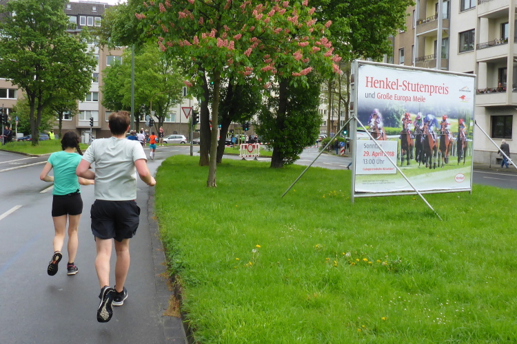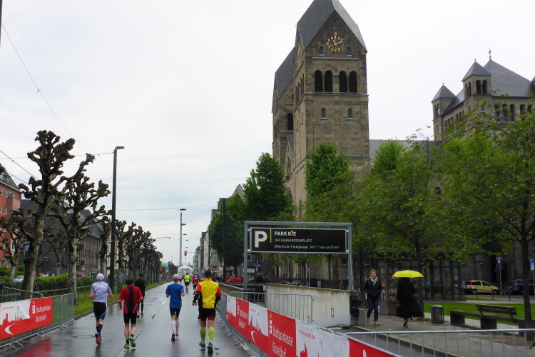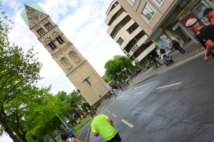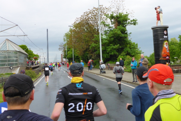 Zunächst kommt eine große Runde nach Norden durch Niederkassel , lateinisch castellum (Festung, Burg). Als ich bei km 19 die Oberkasseler Brücke unterquere, um die kleine Schleife durch Oberkassel zu laufen, wundere ich mich über die vielen Läufer, die jetzt erst über die Brücke laufen. An der Halbmarathonmarke rechne ich mir aus, dass eine 4:20 heute möglich wäre. Die 4:14er Pacer haben mich überholt, doch ich bleibe dran, als ich mich die fast einen Kilometer lange Oberkasseler Brücke zurück ans rechte Rheinufer quäle. Kann mir jetzt nicht mehr leisten, fürs Fotografieren stehen zu bleiben. Unter der Brücke blöken auf den Rheinwiesen die Schafe. In welcher Großstadt gibt es das schon?