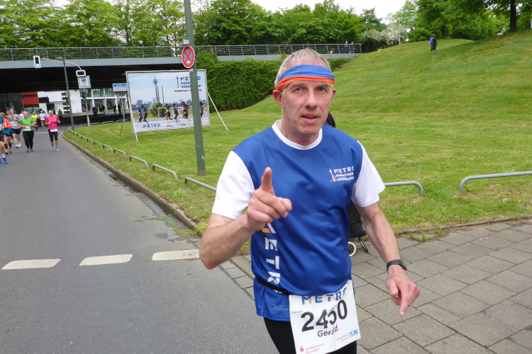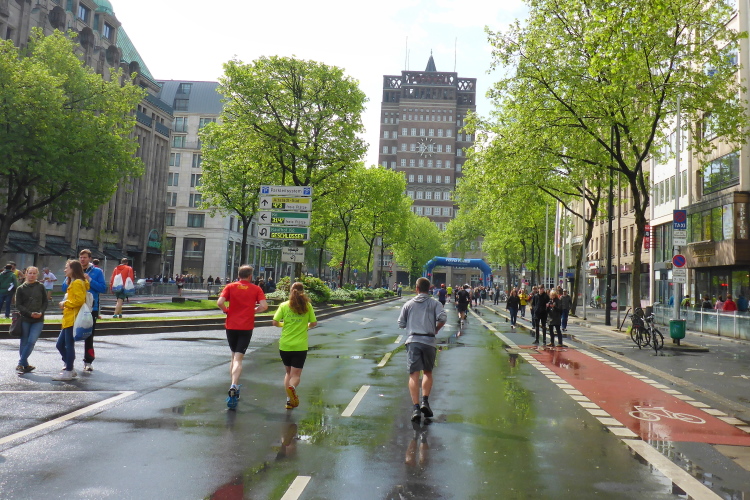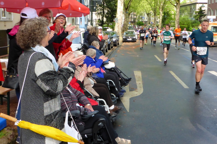 Am Zollhof, km 38, ist das Haus mit den gekrümmten Fassaden, erbaut vom Architekten Gehry , ein gelungener Hingucker. Mit 19 Euro Miete pro qm wäre man drin. Ich wäre eigentlich auch drin, im Ziel, doch mich hat der Mann mit dem Hammer erwischt, ich muss Gehpausen einlegen. Die 4:29 Pacer überholen mich. Bei Km 41 auf der Königsallee wecken mich die Zuschauer, mein Name steht ja auf der Startnummer. Al so höre ich jetzt von allen Seiten: „Joooooe! Hau rein! Du schaffst das! “