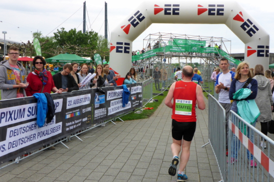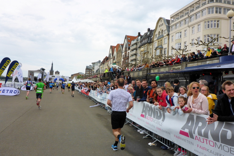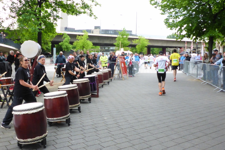 Dann biege ich ab auf die Zielgeraden, die Trommlergruppe haut wie wild auf die Pauken. Ich durchquere riesige Aufbauten, die den Zuschauern das Queren der mit hohen Absperrgittern verengten Zielgeraden ermöglichen. Hände krallen sich in die Gitter und brüllen mich an. Darüber an der Brüstung der Uferstraße noch mehr brüllende Hände. Es ist unglaublich laut hier. Staffelläufer werden nach links abgetrennt, somit keine händchenhaltenden Hindernisse vor mir. Super, ich kann auf den letzten Metern nochmal Stoff geben und ein zufriedenes 4:31 finishen.