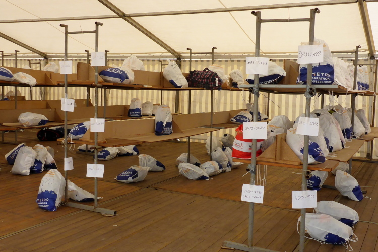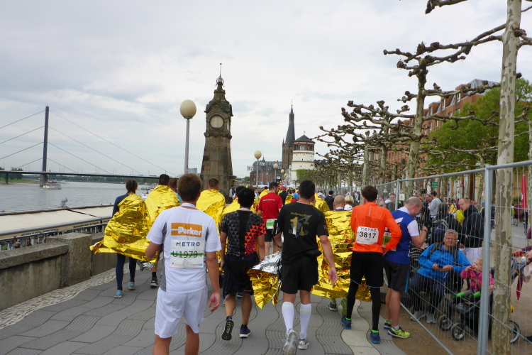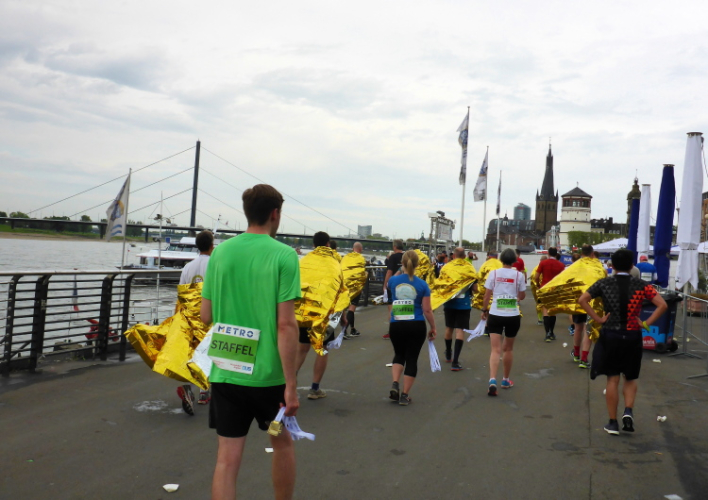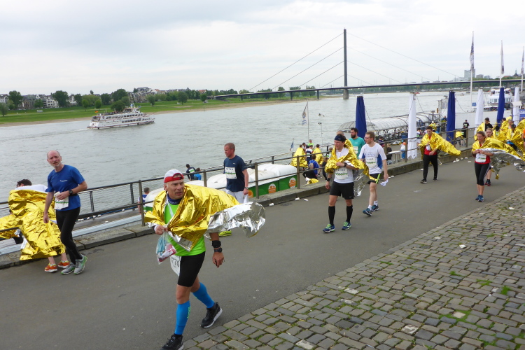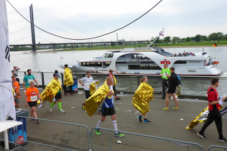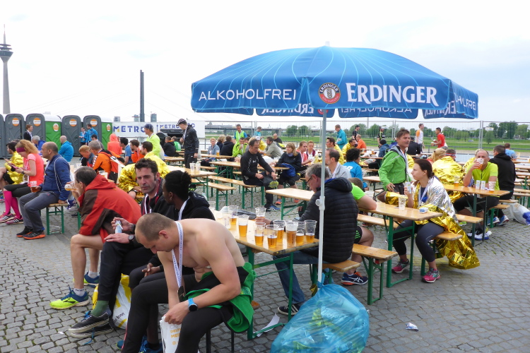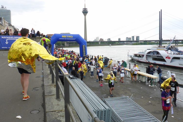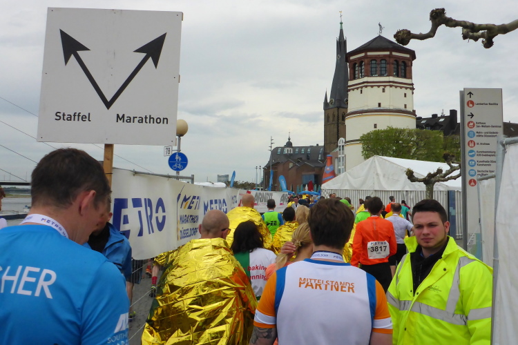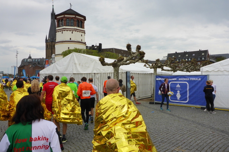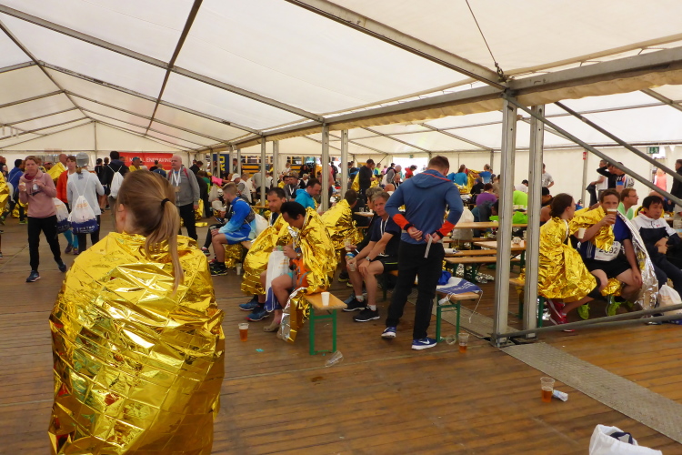 Auch nach dem Zieleinlauf geht die perfekte Orga weiter: Viel Platz hinter der Ziellinie, man kann also erst mal durchatmen. Thermofolien, Sanitäter rechts, Wasserbecher links, Medaillen weiter hinten, damit es kein Gedränge gibt. Marathonläufer bekommen eine tellergroße Medaillen, Staffelläufer kleine. Bis zur Zielverpflegung können wir gemütlich durchatmen und uns sortieren. Ordner gucken ganz genau auf die Startnummern, damit kein Kurzläufer uns Langstrecklern die Auslagen plündert, oder sich gar mit ner kleinen Medaille in unsere Duschen verirrt.
