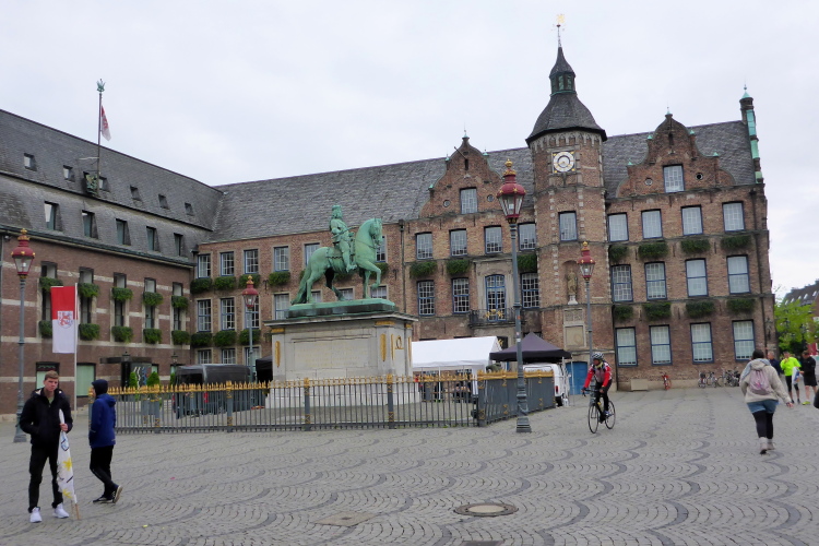 Wir haben noch viel Zeit und schlendern gemütlich Richtung Brücke. Katholisches Stadtdekanat und die Basilika St. Lambertus, das wohl älteste Bauwerk der historischen Kernstadt in niederrheinischer Backsteingotik, sind ein toller Blickfang. Auf einer Wiese ist das Lager der Staffelmannschaften eingezäunt. Noch ist es ruhig.