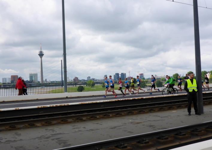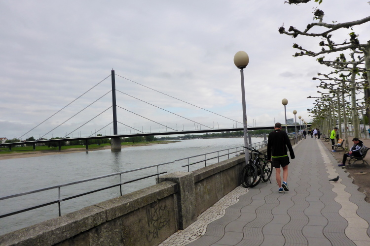 Es geht über die Oberkasseler Brücke, ebenfalls eine Schrägseilbrücke. Bekannt wurde diese Brücke, weil sie an anderer Stelle erbaut und 1976 um ganze 47 Meter versetzt wurde, um die alte Brücke zu ersetzen. Was für ein Aufwand! Neben den beiden Fahrspuren verkehrt hier in der Mitte die Straßenbahn, die die Düsseldorfer Altstadt und den Stadtteil Oberkassel über den Rhein hinweg verbindet. Auf der gegenüberliegenden Fahrspur sind richtig schnelle Läufer unterwegs. Ich genieße den schönen Ausblick auf die Skyline mit dem Fernsehturm und auf die Grünanlagen auf der anderen Seite.