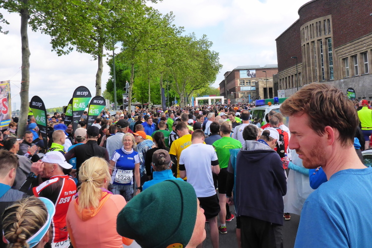 Bald ist der Startbereich unter dem Ulanendenkmal, welches an das in Düsseldorf stationierte Westfälische Ulanen-Regiment Nr. 5. erinnert, gut gefüllt. Norbert und ich starten von hinten, hier ist entspannte Stimmung. Der Moderator fordert alle auf, die Hände nach oben zu strecken und zur Musik zu klatschen. Gerne nehmen die Läufer die Animation an. Ein hier hinten kaum zu hörender Startschuss gibt die Strecke frei. Zu klassischer Musik nähern wir uns der Startlinie und schon kommen wir ins Laufen.