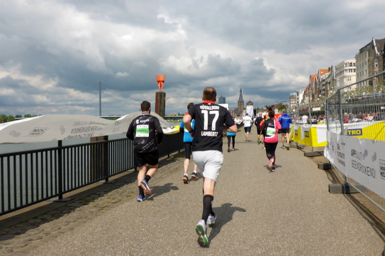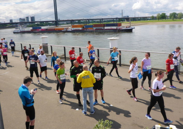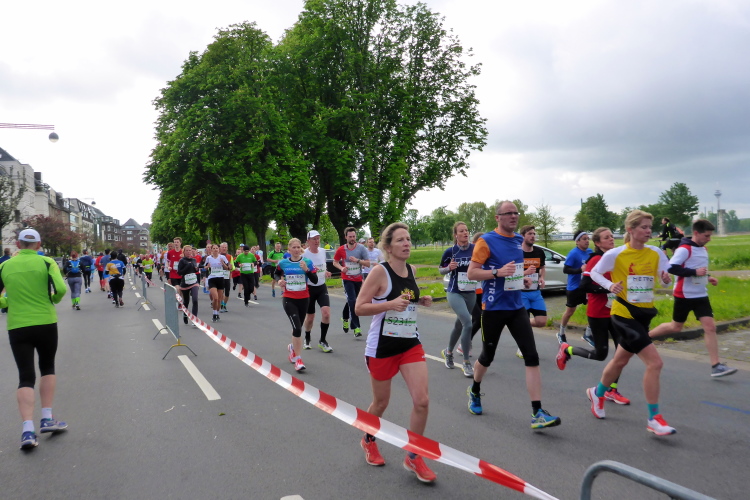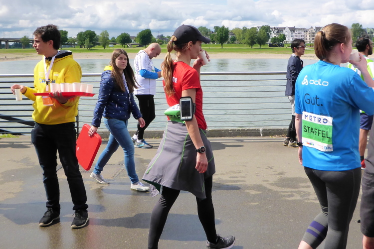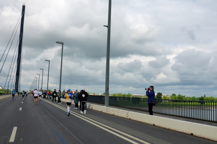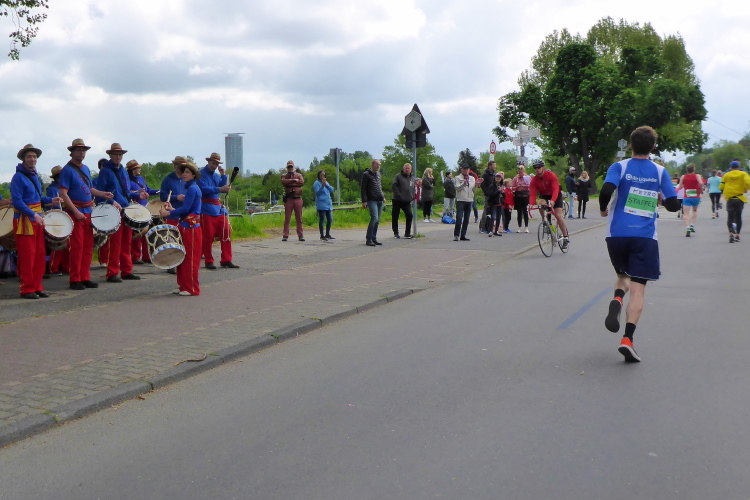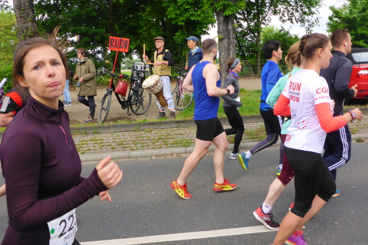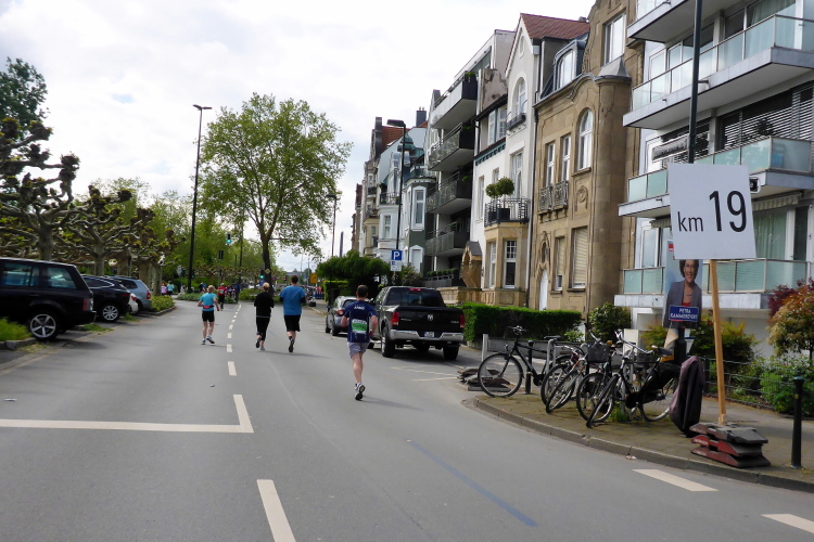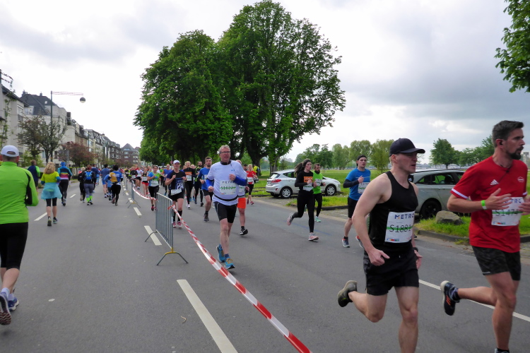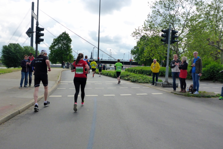 Die Strecke führt durch halb Oberkassel. Die Straßen sind breit mit viel Grün. Dazwischen gibt es schon wieder etwas zu trinken. Wir unterqueren die Theodor-Heuss Brücke bei km 18, Trommler und einige Zuschauer halten die Stellung; dann laufen wir den Kaiser-Friedrich-Ring entlang. Hier spielt live Musik, am VP bei km 20 gibt es Iso und Bananen, auch Gel wird angeboten.