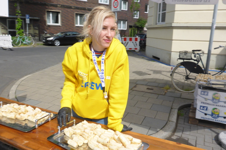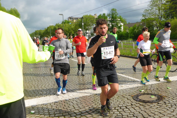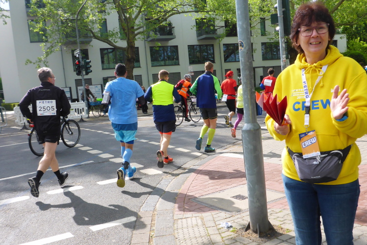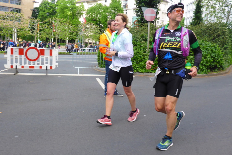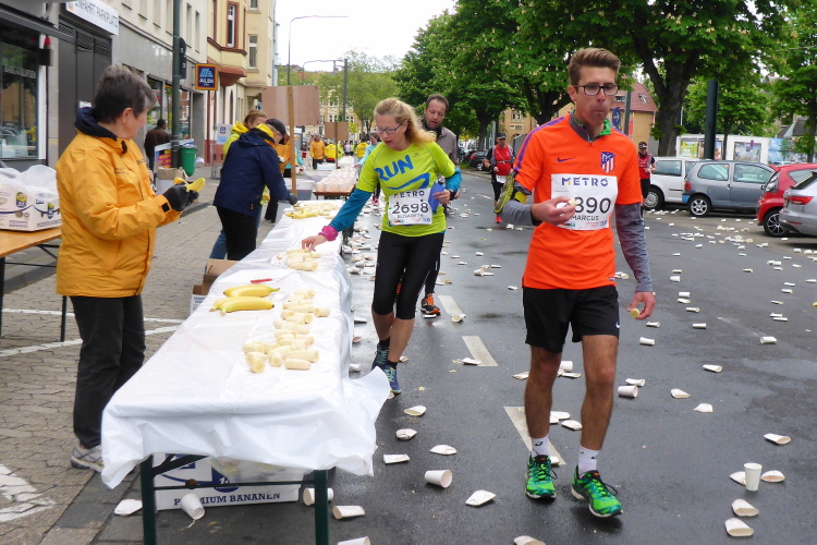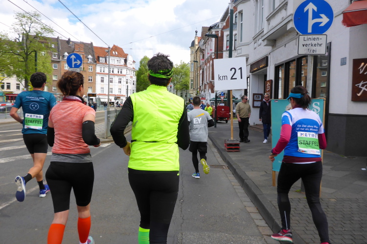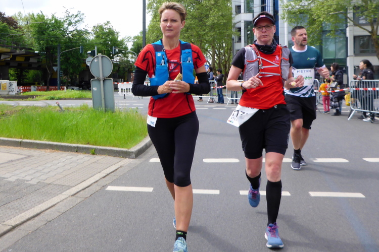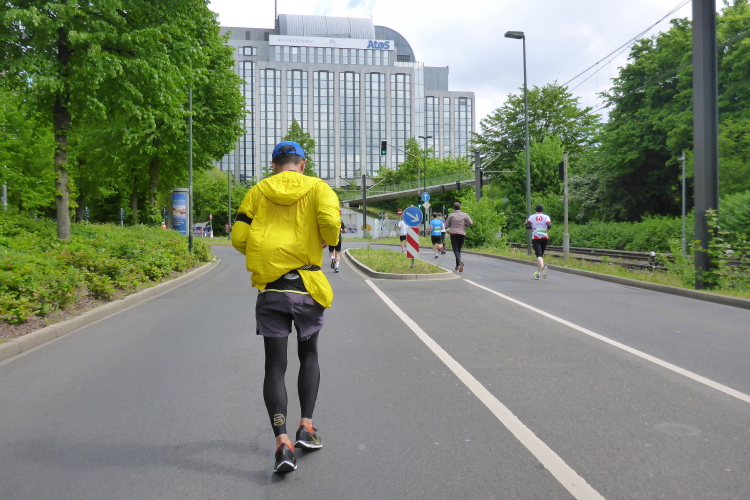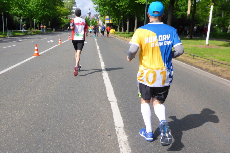 Die Strecke führt durch halb Oberkassel. Die Straßen sind breit mit viel Grün. Dazwischen gibt es schon wieder etwas zu trinken. Wir unterqueren die Theodor-Heuss Brücke bei km 18, Trommler und einige Zuschauer halten die Stellung; dann laufen wir den Kaiser-Friedrich-Ring entlang. Hier spielt live Musik, am VP bei km 20 gibt es Iso und Bananen, auch Gel wird angeboten.