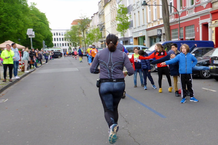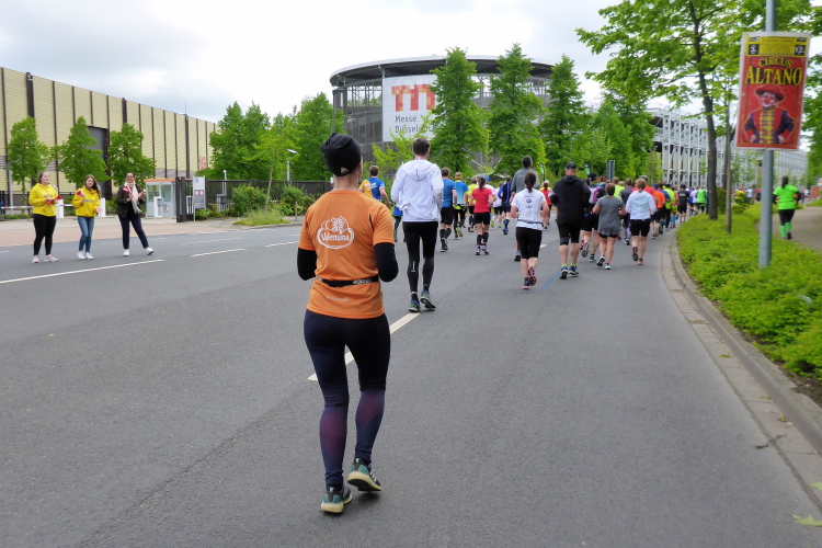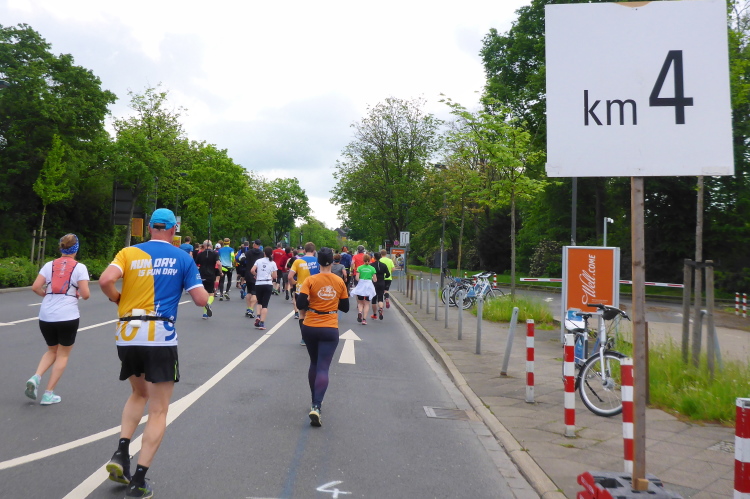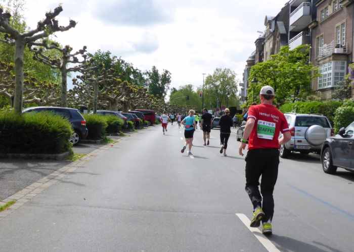 Bei km 7 vor dem Oberlandesgericht geht es links. Die Schaulustigen in der Kurve machen Stimmung. Wir biegen in die Klevener Straße ein, hier stehen kleine Gruppen und feuern uns an. Durch einen Grünstreifen getrennt, erkennen wir die schnellen Marathonläufer auf dem Rückweg. Wie weit die wohl voraus sind?