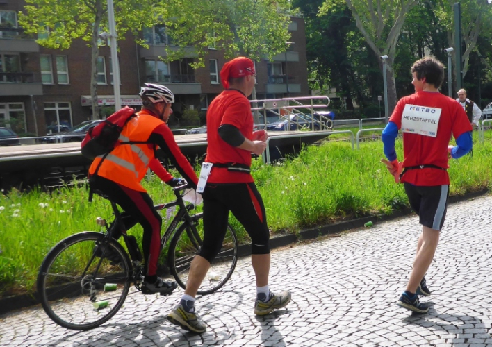Nun wird es spannend: Die Staffeln haben den ersten Wechsel. Zunächst werden sie nach rechts ausgeleitet, wo die zweiten Läufer angespannt warten. Was für ein Gewusel, während wir ohne Störung daran vorbei kommen. Dann werden die Strecken wieder vereint. Die neuen Staffelläufer sprinten an uns vorbei.