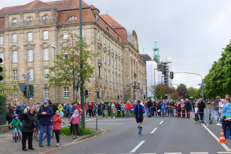 Plötzlich befinde ich mich in einem ganz anderen Rennen. Bisher gab es zwar viele Stimmungsnester, aber immer wieder auch einige ruhigere Passagen. Nun ist es mit der Ruhe vorbei. An jeder Ecke spielt Musik, teils live, teils aus der Konserve. Wo nicht an der Strecke direkt Musik gemacht wird, sind die Fenster geöffnet und die Fans beschallen die Straße mit Rock und Pop- Musik. Nun geht es erneut durch den Hofgarten. Die Tonhallenstraße bringt uns am Franziskanerkloster und der Kirche Maria Empfängnis vorbei.