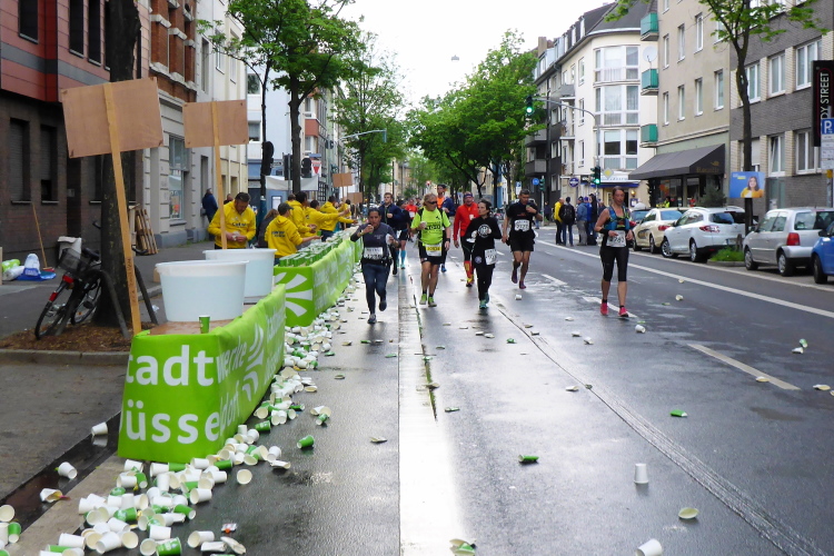 Das Düsseldorfer Messe- und Kongresszentrum CCD kommt in Sicht. Es bietet mit seinem flexiblen Raumangebot für jede Messe, jede Ausstellung und jede Tagung ein maßgeschneidertes Angebot. Vor dem monumentalen Eingangsportal des Nordparks befindet sich die erste Wasserstelle für die Läufer bei km 5. Obwohl es recht frisch ist, greife ich zum ersten Becher.