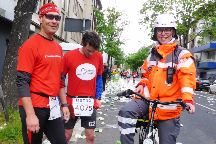 Wieder informiert uns ein großer Aufkleber auf dem Boden: „Noch 3km“. Die Haroldstraße führt im Bogen um das Düsseldorfer Polizeipräsidium herum. Dadurch gelangen wir auf ein Begegnungsstück, wo uns viele frohe aber auch erschöpfte Gesichter entgegenkommen. Diese Läufer sind fast im Ziel.
