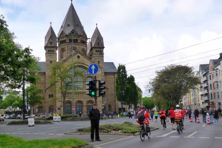 Bei km 10 gibt es wieder Getränke. Ich verliere meine Begleiter und sehe nachher auf der Ergebnisliste, dass Benedikt in der Zeit von 4:44 das Ziel erreicht hat. Das nenne ich Punktlandung. Zweimal rechts und wir biegen nun erneut in das Begegnungstück Klevener Straße, aber dieses Mal von der anderen Seite, ein. Weithin sichtbar an einer großen Kreuzung kann man die evangelische Kreuzkirche (Achtung ein Wortspiel) nicht übersehen. Sie wurde 1910 erbaut und hat unter anderem den Speyrer Dom als Vorbild.