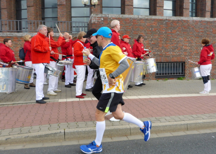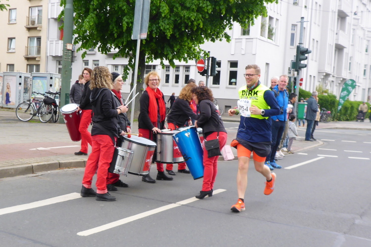 Den Brehmplatz, wo viele Zuschauer auf uns warten, erreichen wir aus verschiedenen Richtungen mehrmals, eine Band spielt den Ray Charles Klassiker „Hit the road Jack“ in einer hervorragenden Jazz Version. Ich würde gerne stehen bleiben, um es mir komplett anzuhören. Aber bei mir läuft es gerade so gut, daher laufe ich weiter und singe vor mich hin.