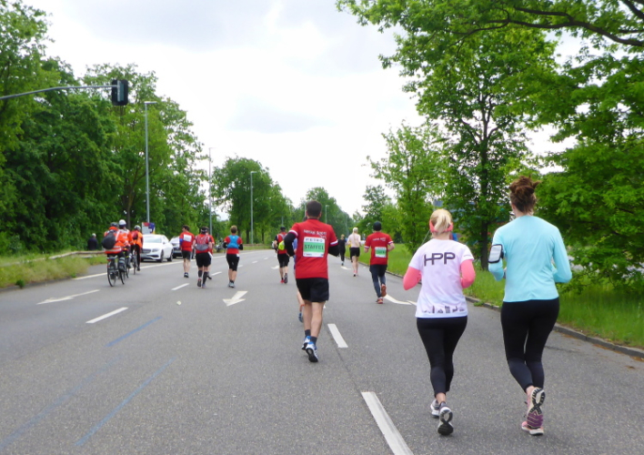 Mit Benedikt und Szymon, ein gebürtiger Pole, habe ich nette Begleiter. Benedikt ist Marathonnovice mit Zielzeit 4:45. Er schlägt ein flottes Tempo an. Ich sollte es besser wissen, gehe aber trotzdem einfach mal mit. Benedikt ist letztes Jahr beim Staffelwettbewerb das Schlussstück gelaufen und zeigt sich begeistert vom Publikum, das uns bereits auf den ersten Kilometern frenetisch anfeuert. Gerade ertönt der Tote Hosen Song „Tage wie dieser“. Ich schmettere entzückt mit.